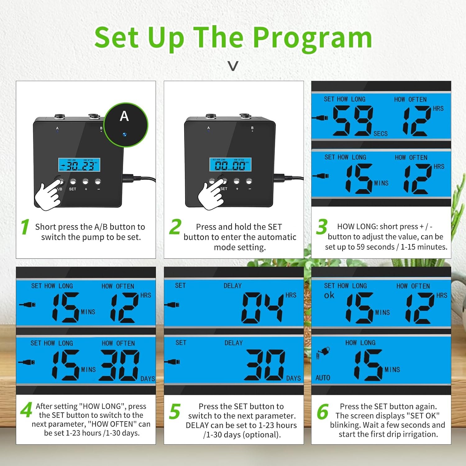 【Timed Drip Irrigation System】 LDE screen interface, single watering time can be set 1-59 seconds /1-15 minutes, watering interval can be set 1-23 hours /1-30 days. Once programmed, the Settings are automatically stored in the internal memory, even if the power is off.