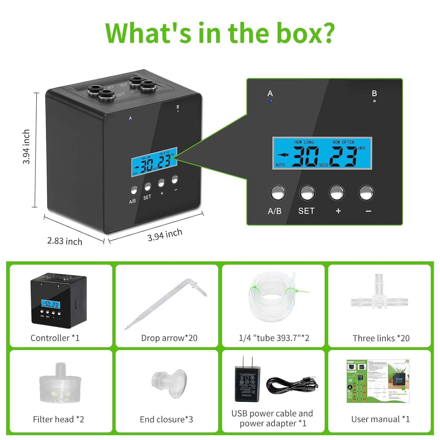 【Easy Installation】DIY set of automatic drip watering equipment with clear instructions and all necessary components: host (1 set),1/4 “tube 393.7 hose (2 rolls), irrigation dropper (20 pieces), tee joint (20 pieces), filter (2 pieces), plug (3 pieces), power adapter and USB power cord (1 piece), user manual 1.