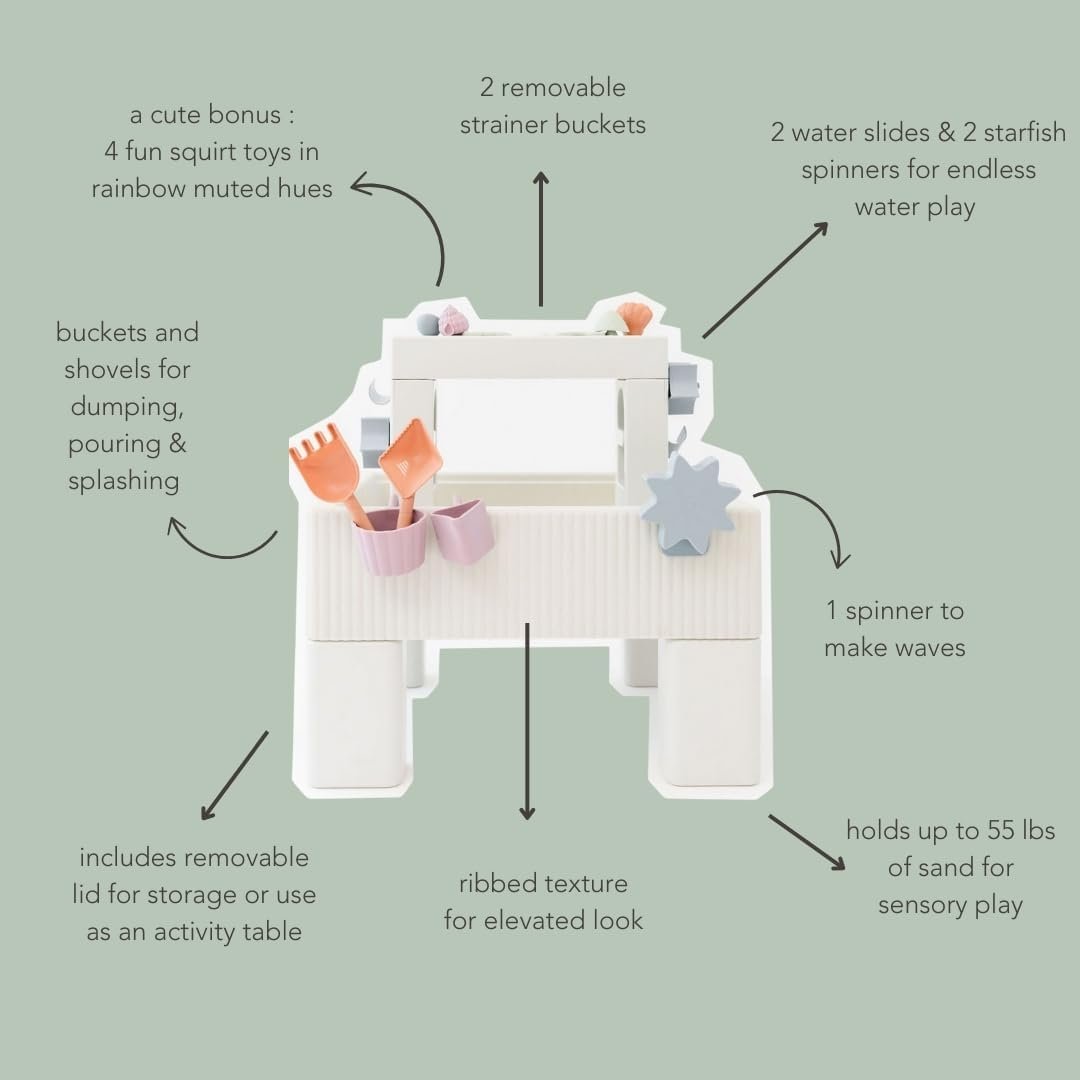 Built to Last: Thoughtfully designed for year-round use, our durable water play table offers endless versatility. In the summer, take it outdoors for fun with water and sand—it holds up to 25 kg (50-55 lbs) of sand! During colder months, bring it inside to use as an activity table for crafting, coloring, and snacking by storing all of the accessories in the table with the included tabletop lid.