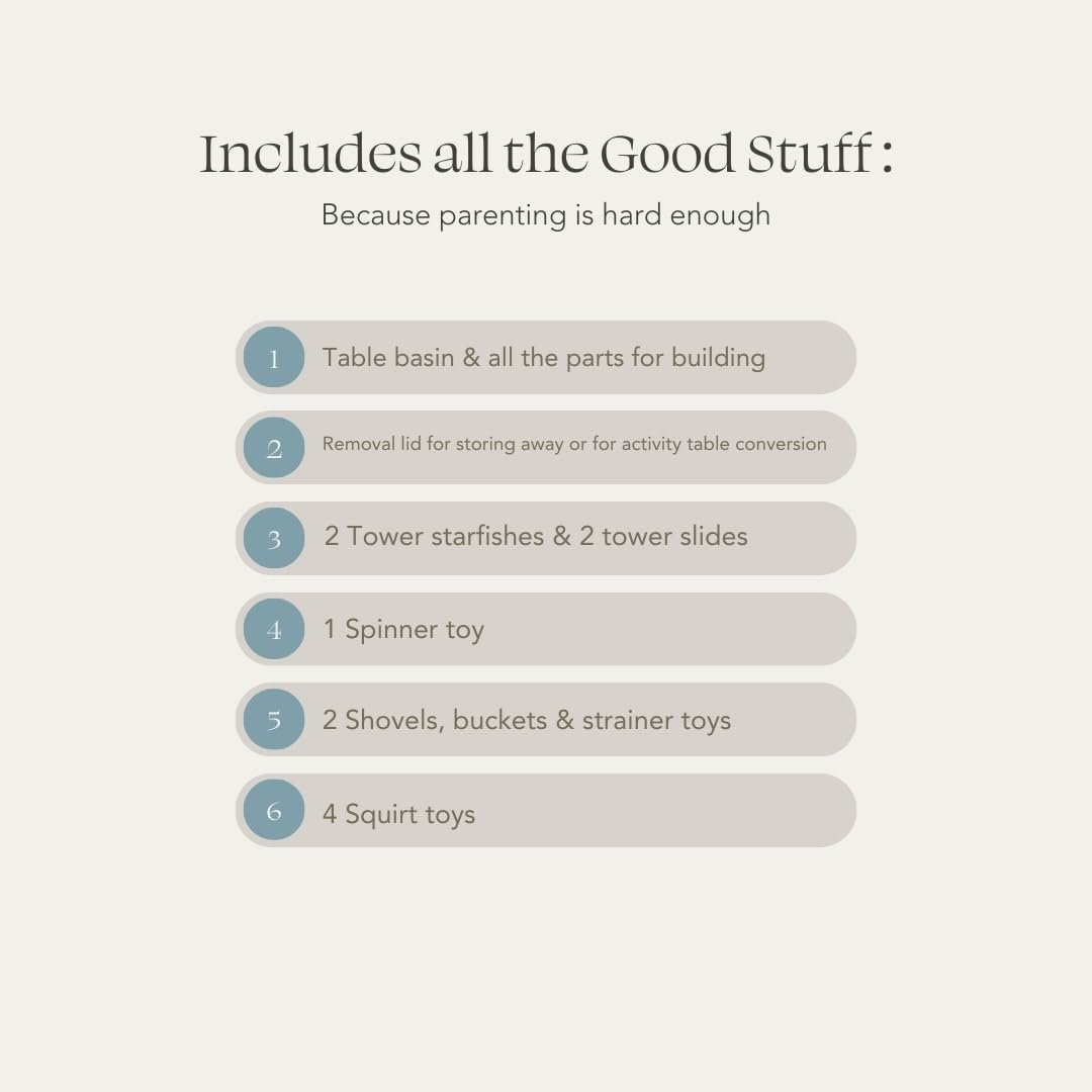 Easy Assembly: The Tide Water & Sensory Table includes: 1 table base, 1 basin lid, 1 drain plug, 4 legs, 2 towers, 1 tower connecter, 2 tower backplates, 2 tower slides, 2 tower starfish, 2 strainer toys, 1 starfish gear, 4 squirt toys, 2 shovels, and 2 buckets.