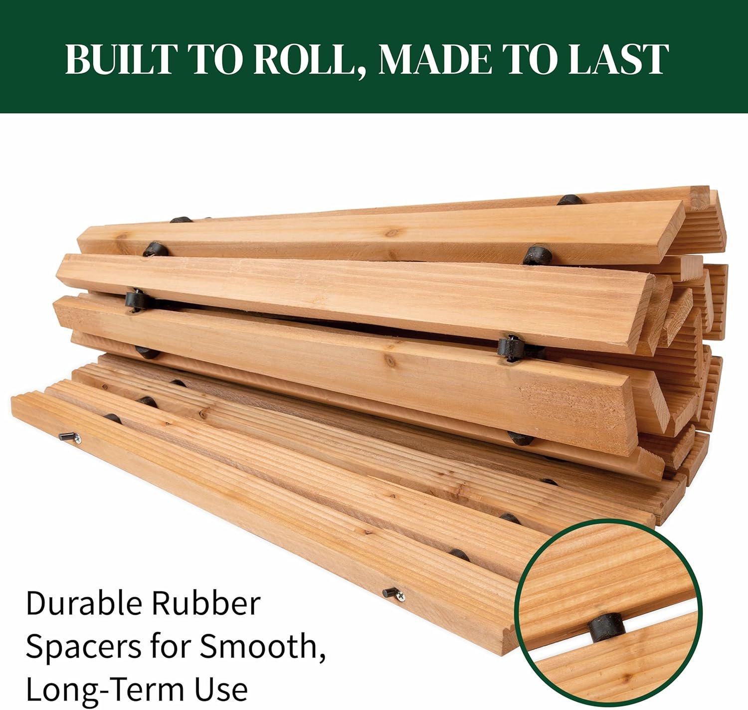 Roll out our wooden curved pathway & stay High & dry while crossing damp or muddy ground. Naturally weather-resistant cedar planks are joined with wire & rubber spacers to create these portable, easy-to-use walkways. Curved pathway lets you add a path around plantings or along borders. Easy to clean & store: just rinse with a hose, roll it up & Pack it away. Size: 4’l x 18”w.