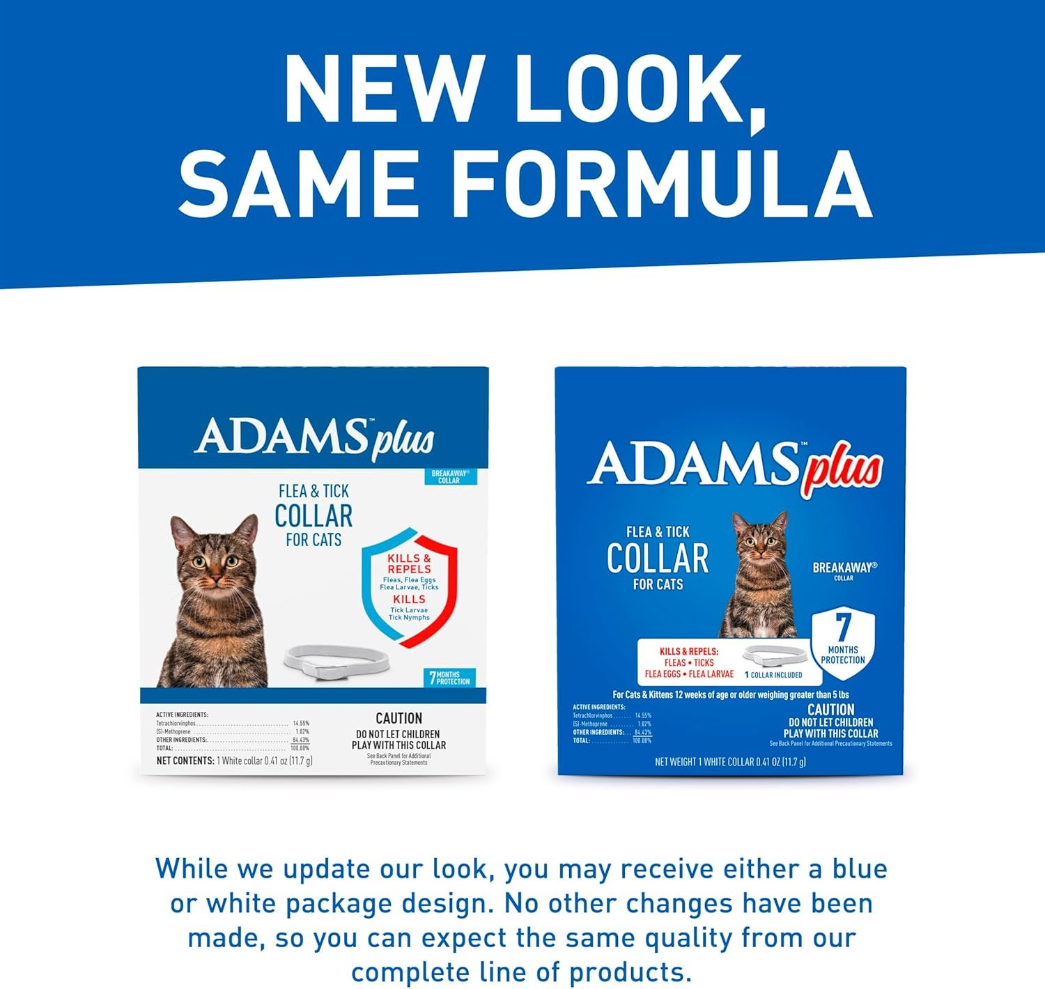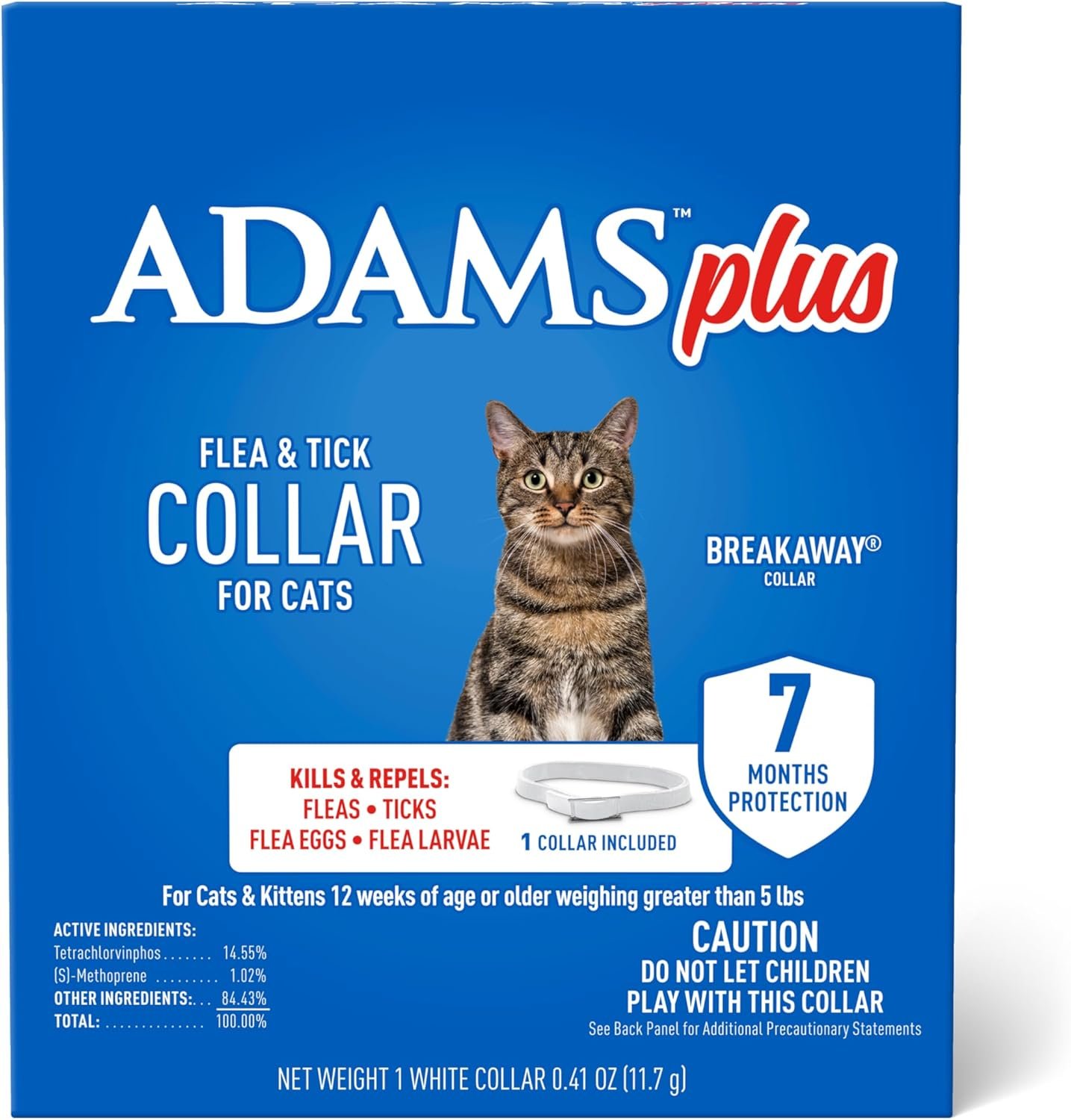ADAMS Plus Flea & Tick Collar for Cats helps prevent infestations by killing fleas and ticks for up to 7 months. Our one-size-fits-all flea and tick collar ensures you are receiving top-of-the-line flea and tick treatment for small, medium, and large cats alike. This collar is water-resistant, and does not need to be removed if it becomes wet. This collar can also be worn with a regular collar. The Breakaway collar features an easy release snap which allows the collar to come undone if snagged on a branch, furniture, or other objects in your cat’s environment. ADAMS Plus Flea & Tick Collar For Cats is an odorless, non-greasy alternative to topical treatments to kill fleas that may cause flea allergy dermatitis, flea bite anemia, and/or may transmit tapeworm. With 5% of fleas living on your cat and the remaining 95% living in your home or yard, it is important to also address the infestations that can be occurring in your home and yard. ADAMS products are designed to provide you with the power to prevent pests on every front. Try ADAMS Flea & Tick Home Spray, specifically designed to use inside your home, and ADAMS Yard & Garden Spray.