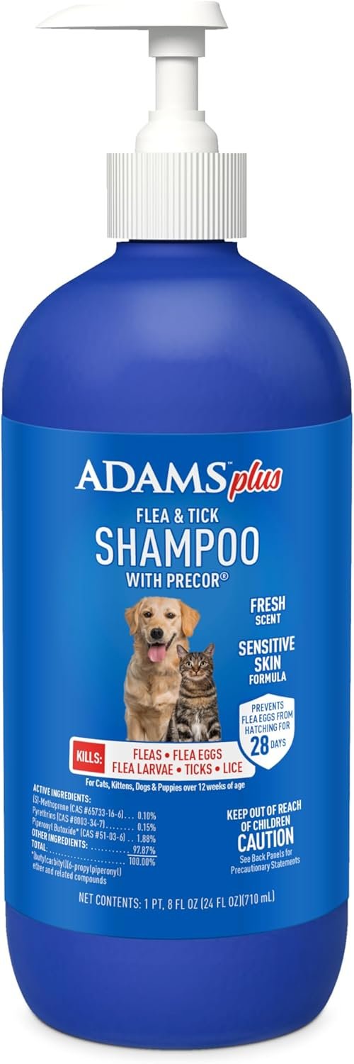 ADAMS Plus Flea & Tick Shampoo with Precor is a sensitive skin, lathering shampoo enriched with aloe, lanolin, coconut extract, and oatmeal to help condition the skin and coat, while removing loose dandruff, dirt and scales. Plus, it leaves your dog’s coat soft, shiny, and manageable. In addition, the lightly scented fragrance leaves your dog smelling pleasantly fresh. This shampoo kills adult fleas, ticks, and lice on contact. In addition to eliminating active infestations, the active ingredient Precor, an Insect Growth Regulator, controls flea infestation for up to 28 days. This shampoo works on dogs and puppies 12 weeks and older. With 5% of fleas living on your pet and the remaining 95% living in your home or yard, flea and tick control requires a multi-step product solution. ADAMS products are designed to provide you with the power to prevent pests on every front. Shop our entire line of Pet, Home, and Yard products to complete your dog and cat flea and tick control regimen.