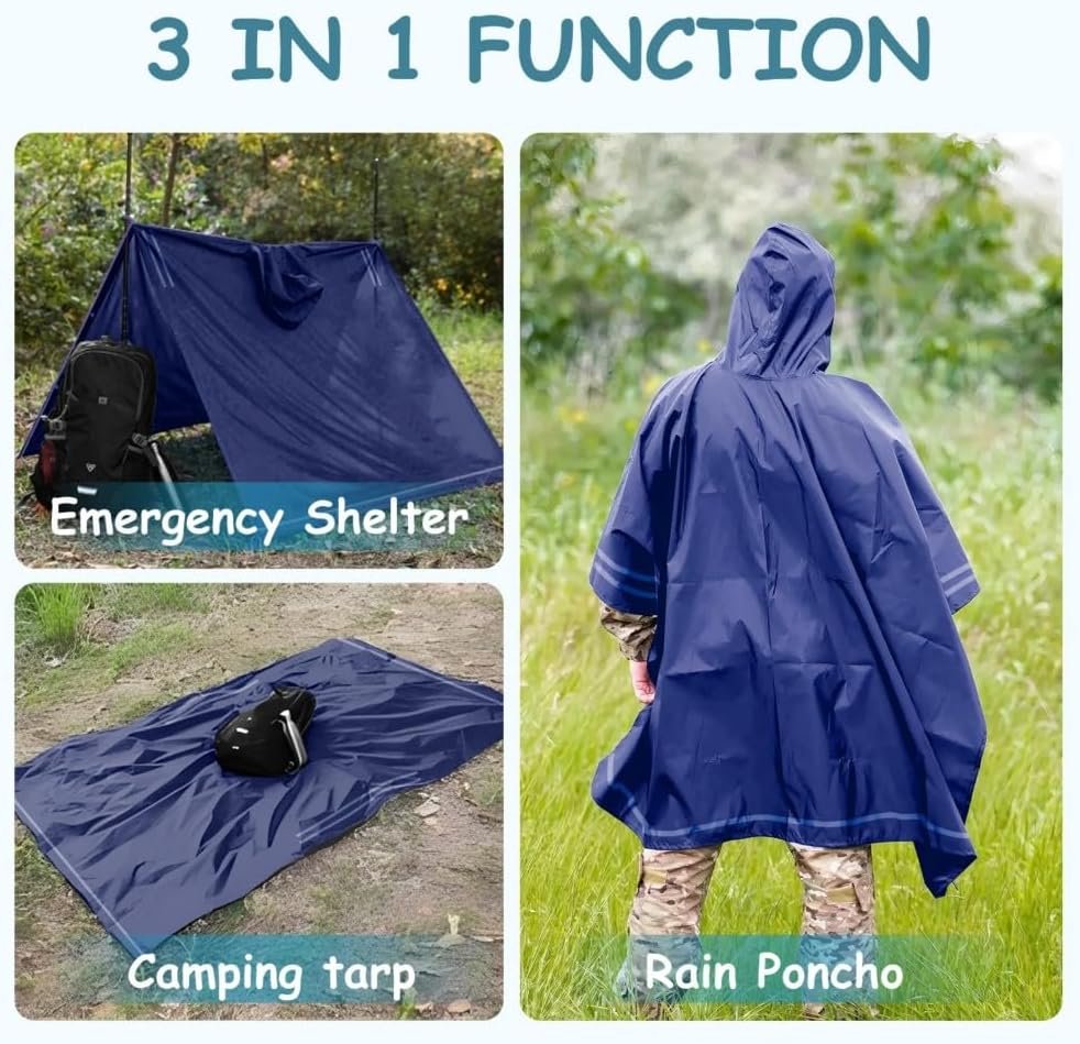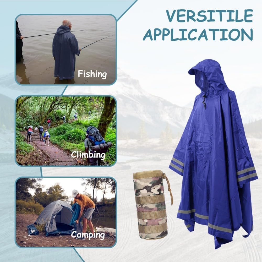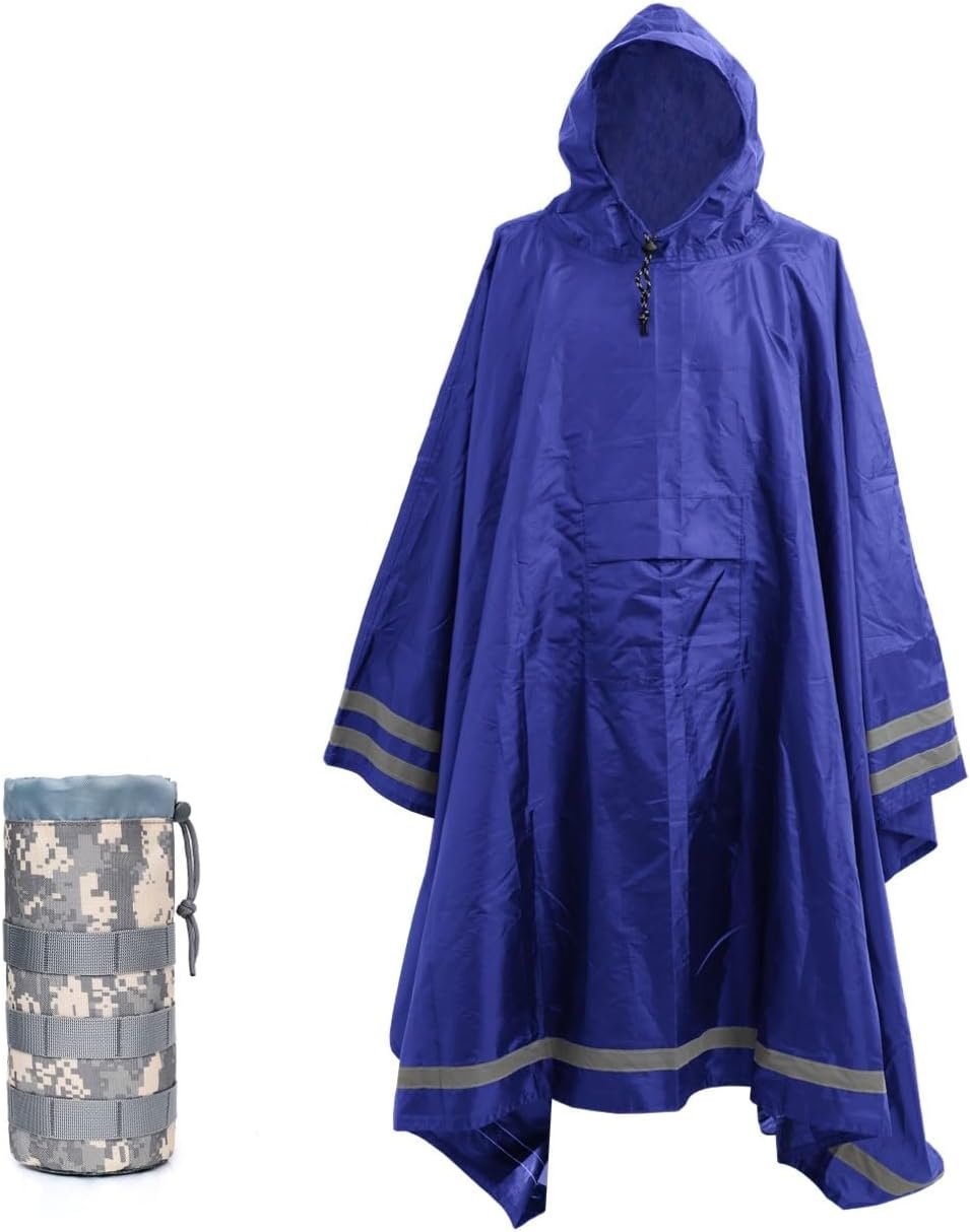 This extra large plus size compact rain poncho with hood and reflective stripes belongs to our newest outdoor tactical/survival kit. It is a multi use rain poncho. Beside from being a heavy duty ponchos adults, it can be used flat on the ground as a camping tarp for outdoor picnic. Four grommets on each corner with reflective stripes can be used to set it up as an emergency shelter during hiking, camping, hunting, fishing, and other outdoor activities. Our tactical poncho, heavy duty ponchos adult, is also suitable to be used as a sun shade to cover the goods in outdoor activities.