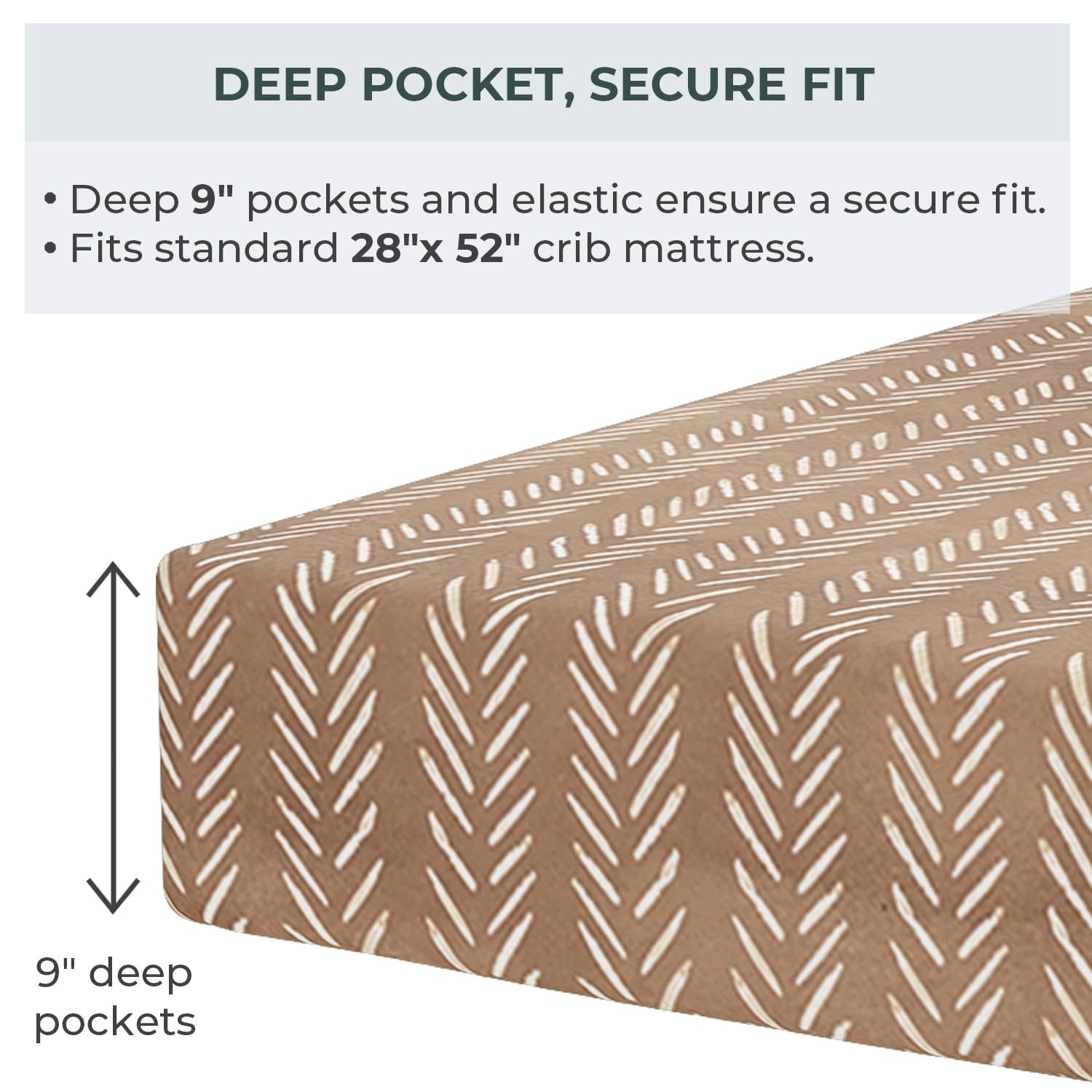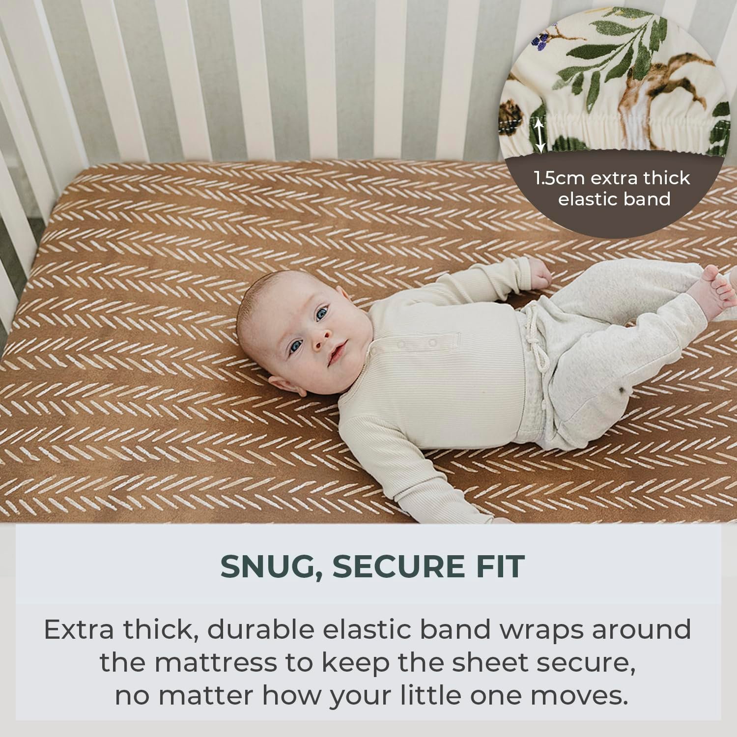 SOFT, STYLISH, AND SAFE: Experience the luxurious softness and breathability of our premium nursery bedding. Crafted from ALWAYSOFT, our custom-milled blend of 96% combed ringspun cotton and 4% spandex, the sheets provide a snug and secure fit. The thick, durable elastic band wraps entirely around the mattress, ensuring the sheet stays in place even when your little one is rolling, sleeping, or jumping.