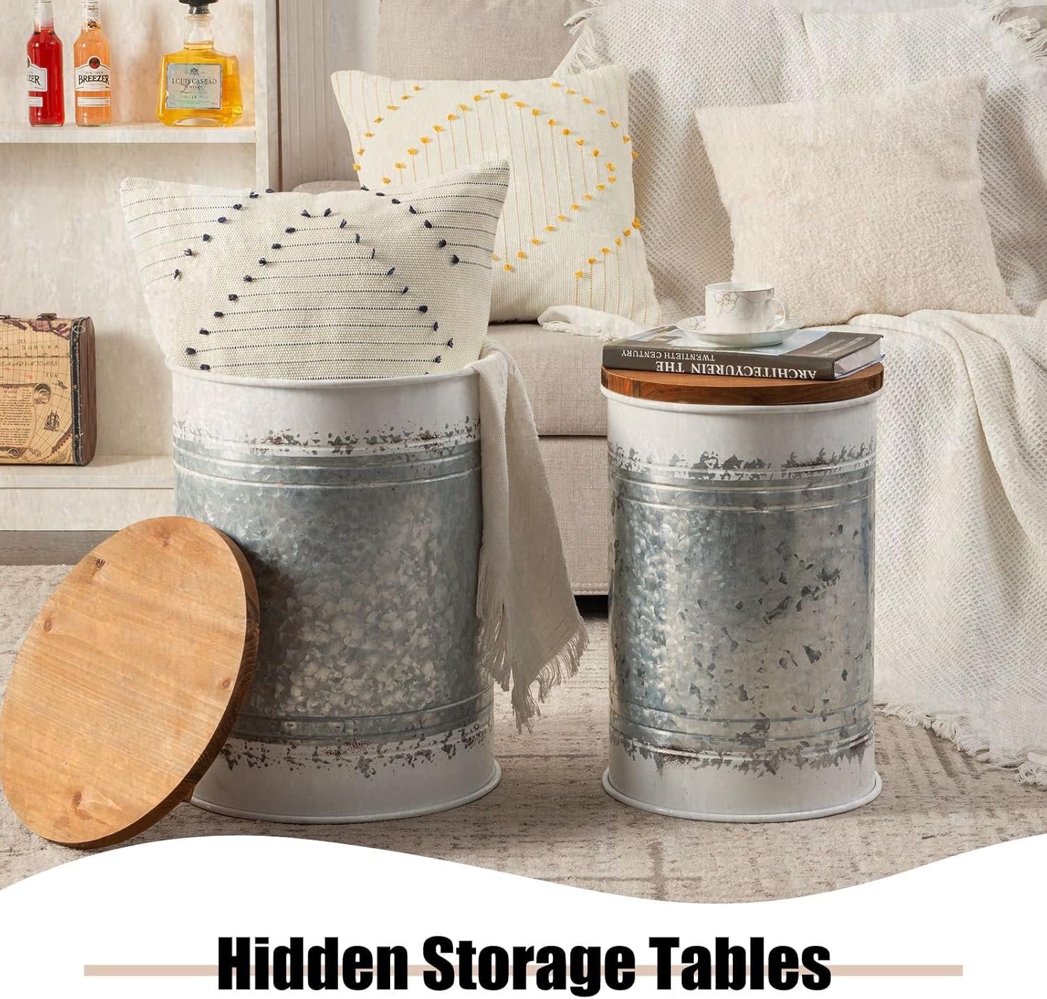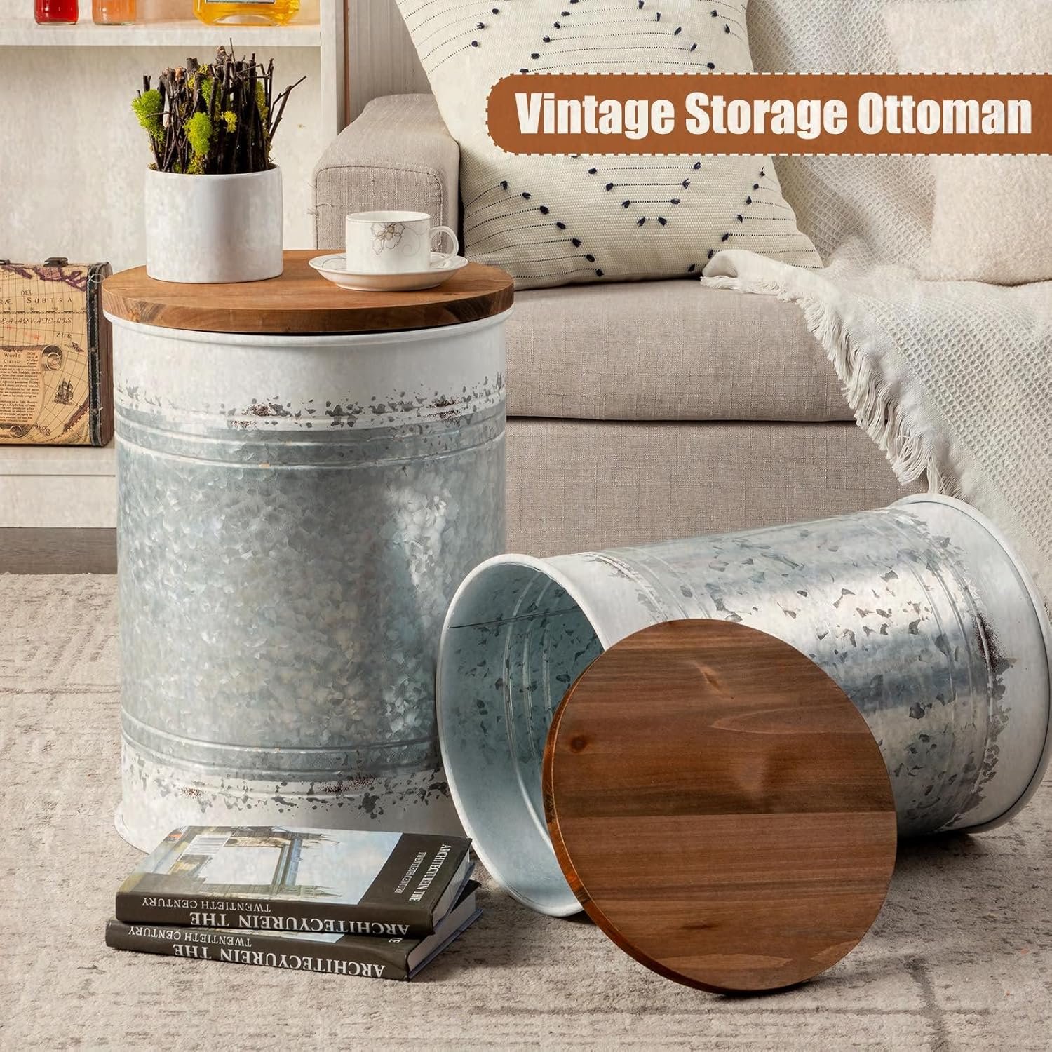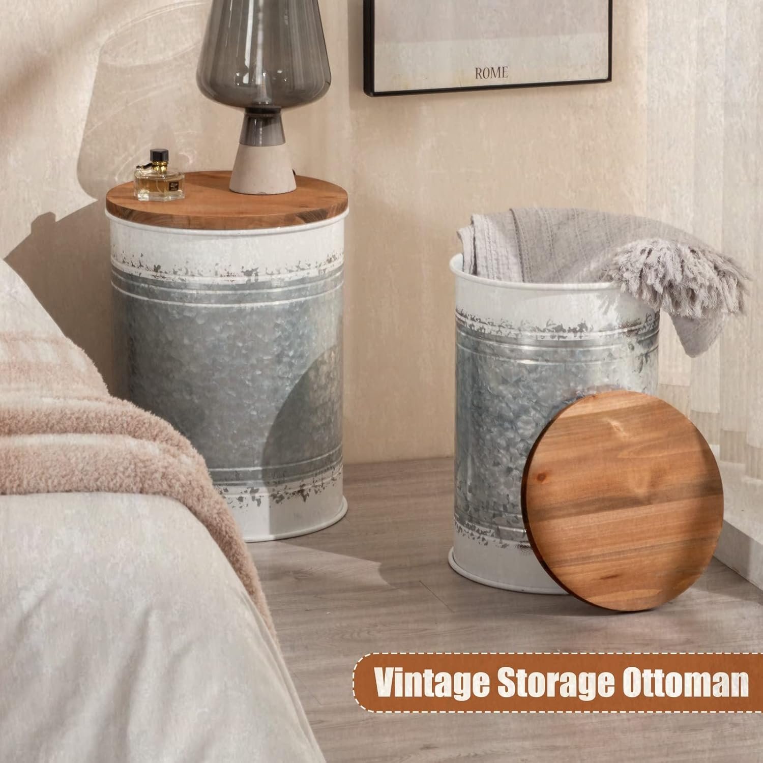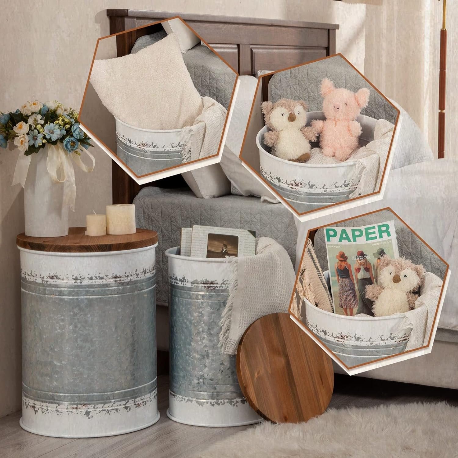 【Farmhouse Accent Decor】Designed with an antiqued galvanized metal finish and round wood lid. Antique and country cottage style, perfectly with rustic home accent furniture.