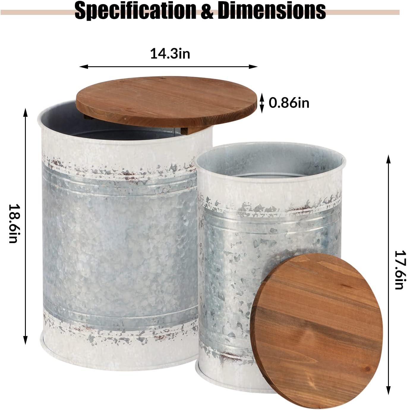 【Set of 2 Tables】This kit contains 2 farmhouse end tables and nest nicely together. Large: 14.3″D x 18.6″H; smaller one: 12″D x 17.6″H. They could hold 200 LBS weight with 0.86 inch lid. No tools! No assembly!