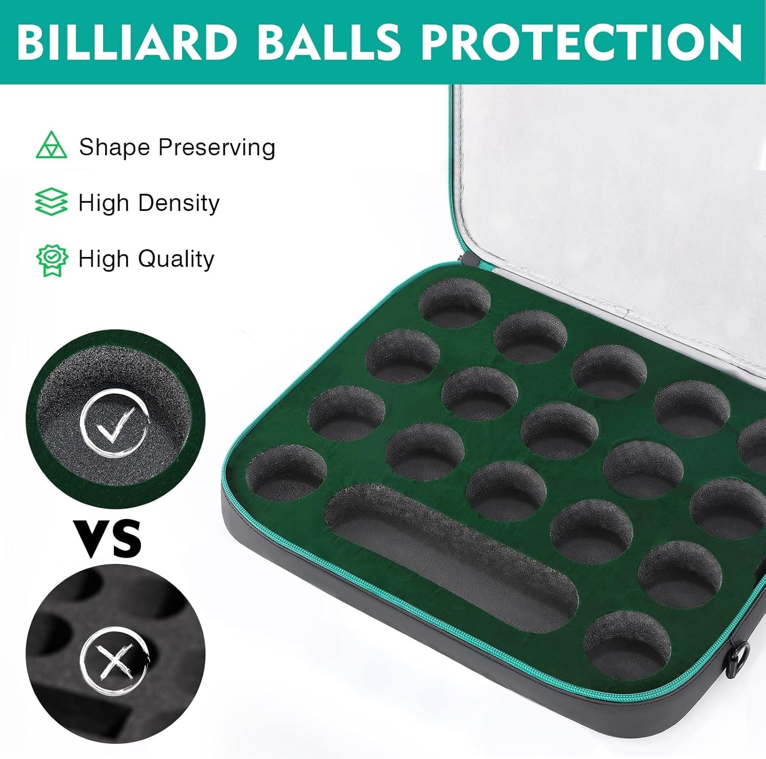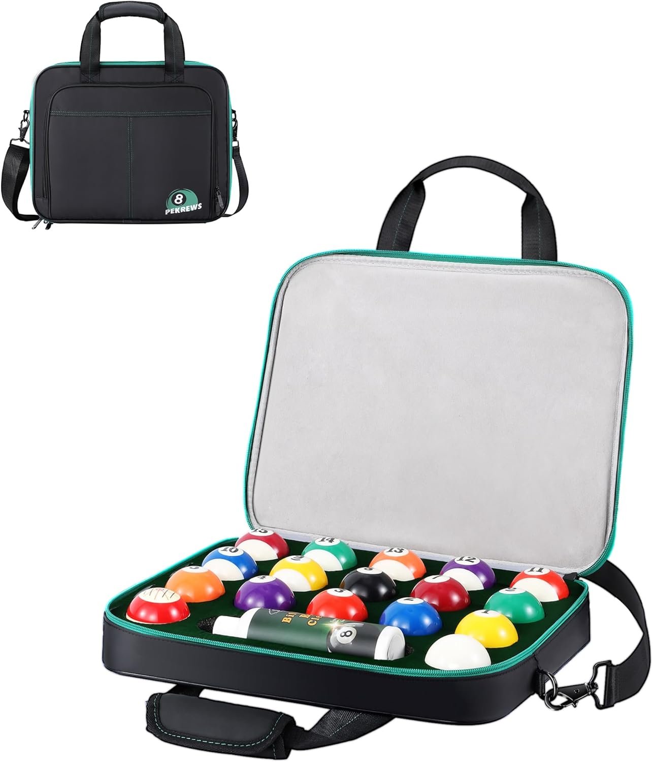 FOAM PROTECTION: Inside PEKREWS pool ball case, billiard balls set fit snuggly into custom individual foam inserts so they are separated and do not knock against each other causing a rattle or damage. The 4cm thickened higher-density foam cushioning is tough enough to keep forms and firmly hold billiard balls in the cutout openings. The foam padding is also designed for players to grab pool table balls easily, and is removable for cleaning or when it is time to play