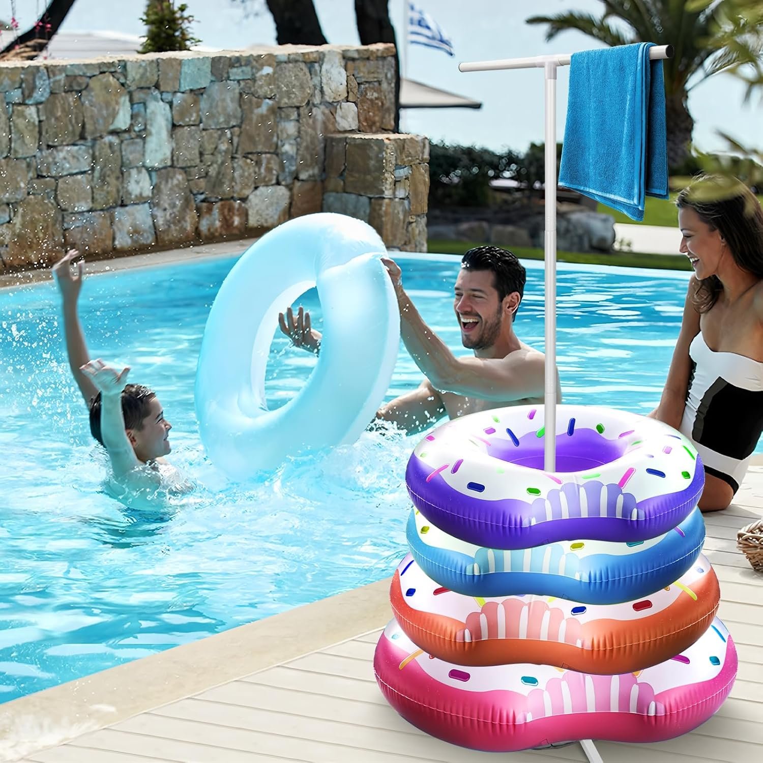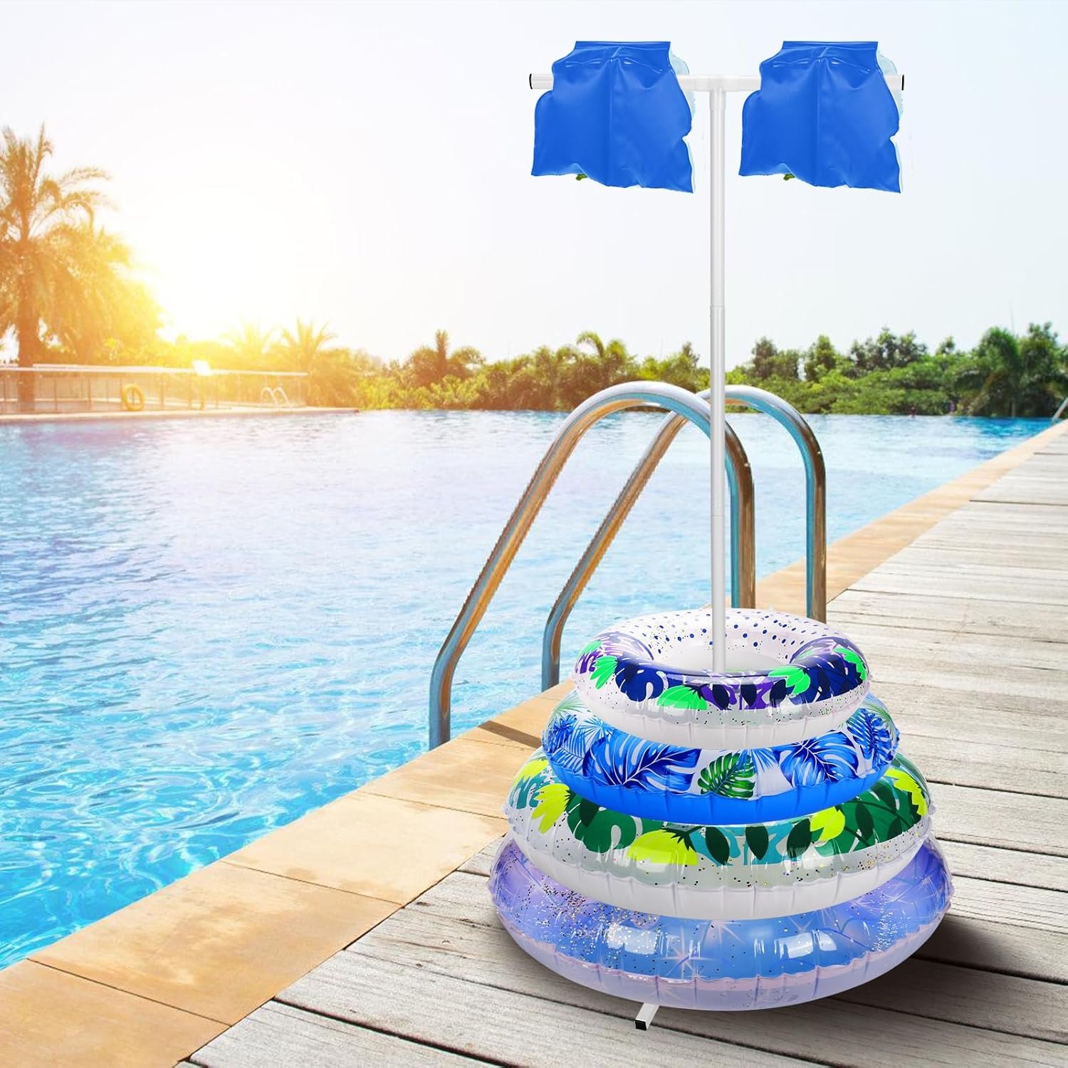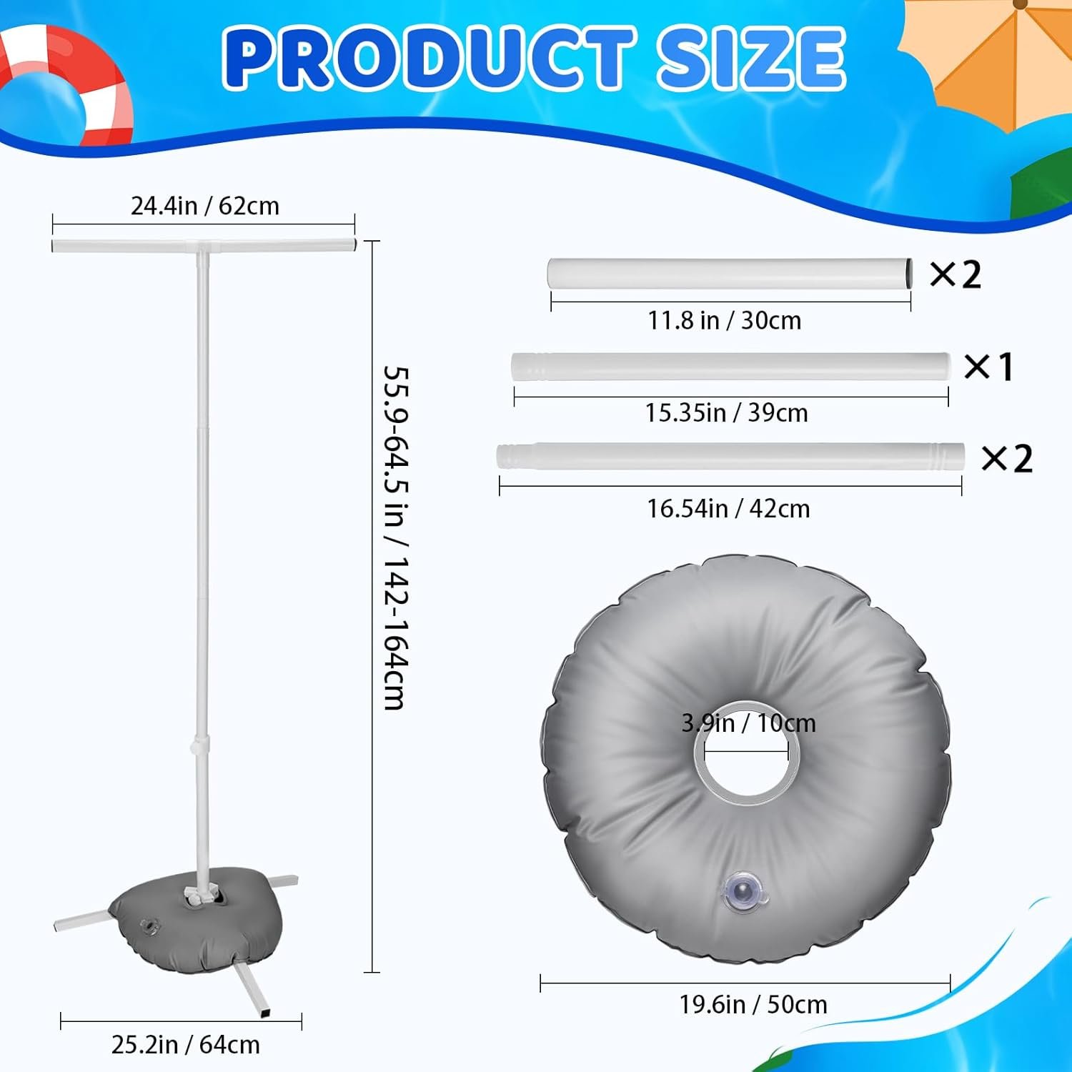 Adjustable Size: The center pole can be adjusted from 55.9″ to 64.5″ (H), can conveniently stack about 6-8 different pool floats, each top tube measures 11.8”(L), can hang towels or other swimming accessories