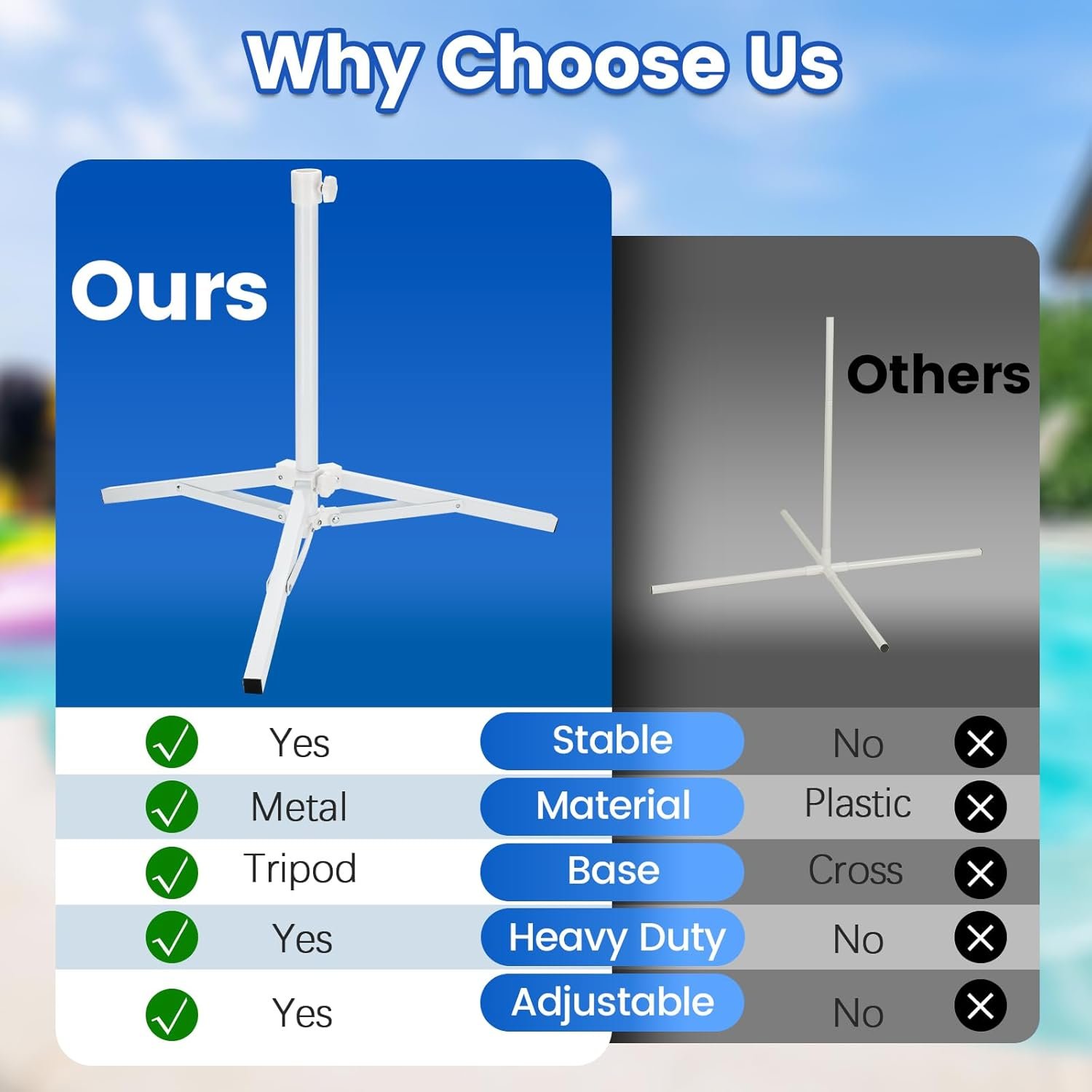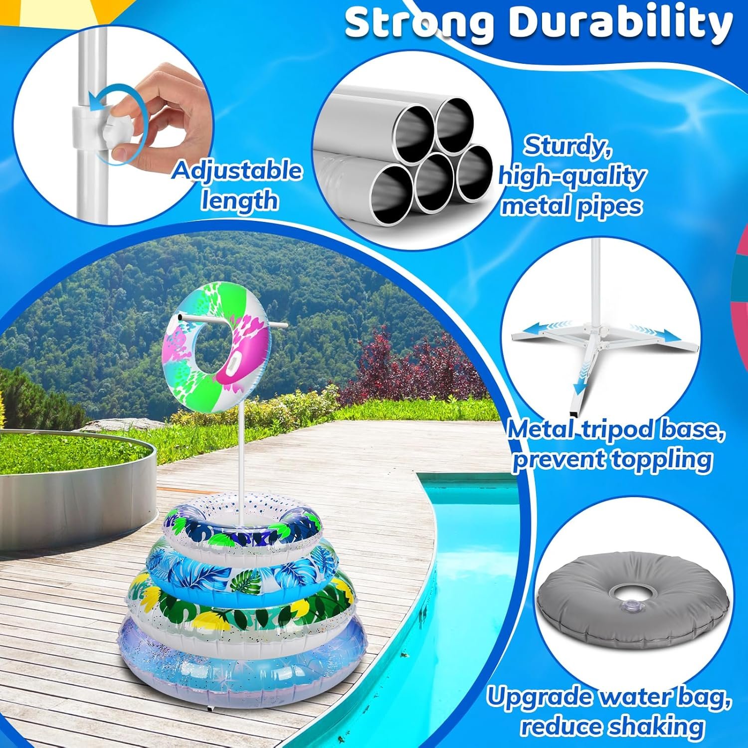 Metal Tripod & Simplified Assembly: Pool float Holder Rack features with a sturdy metal tripod base, stable and easy to assemble, just open the tripod base, fill the water bag, and insert the other tubes easily