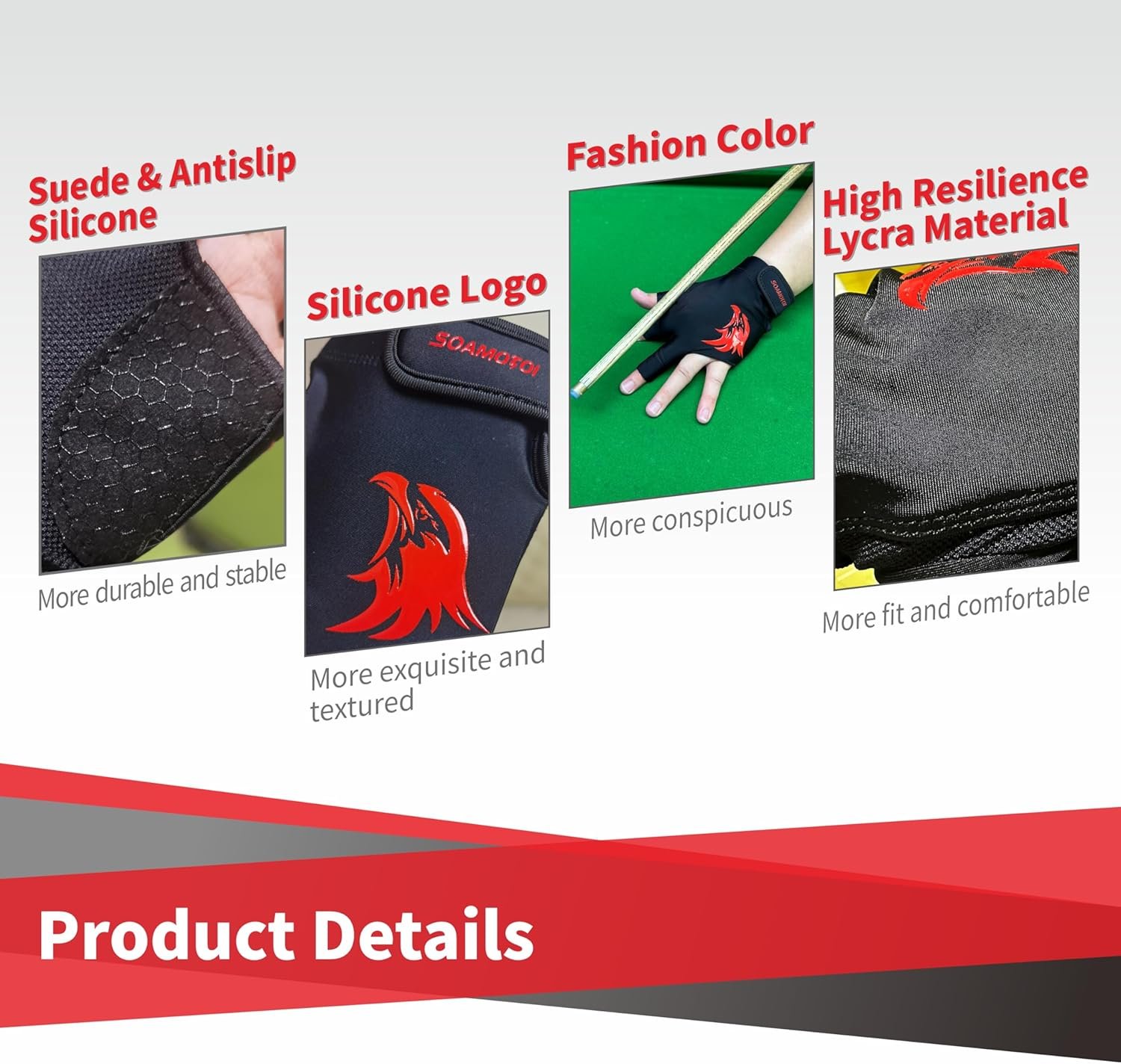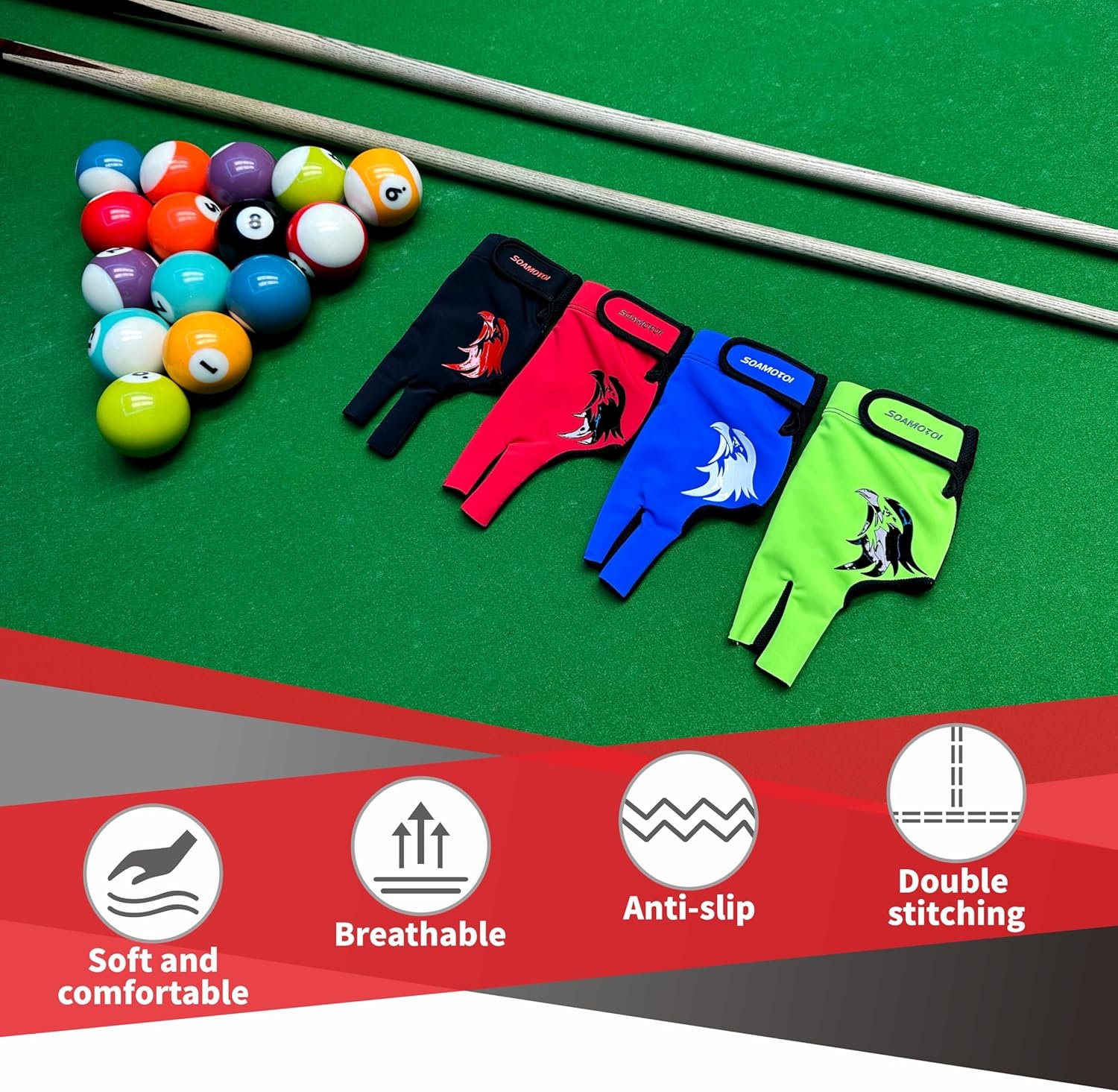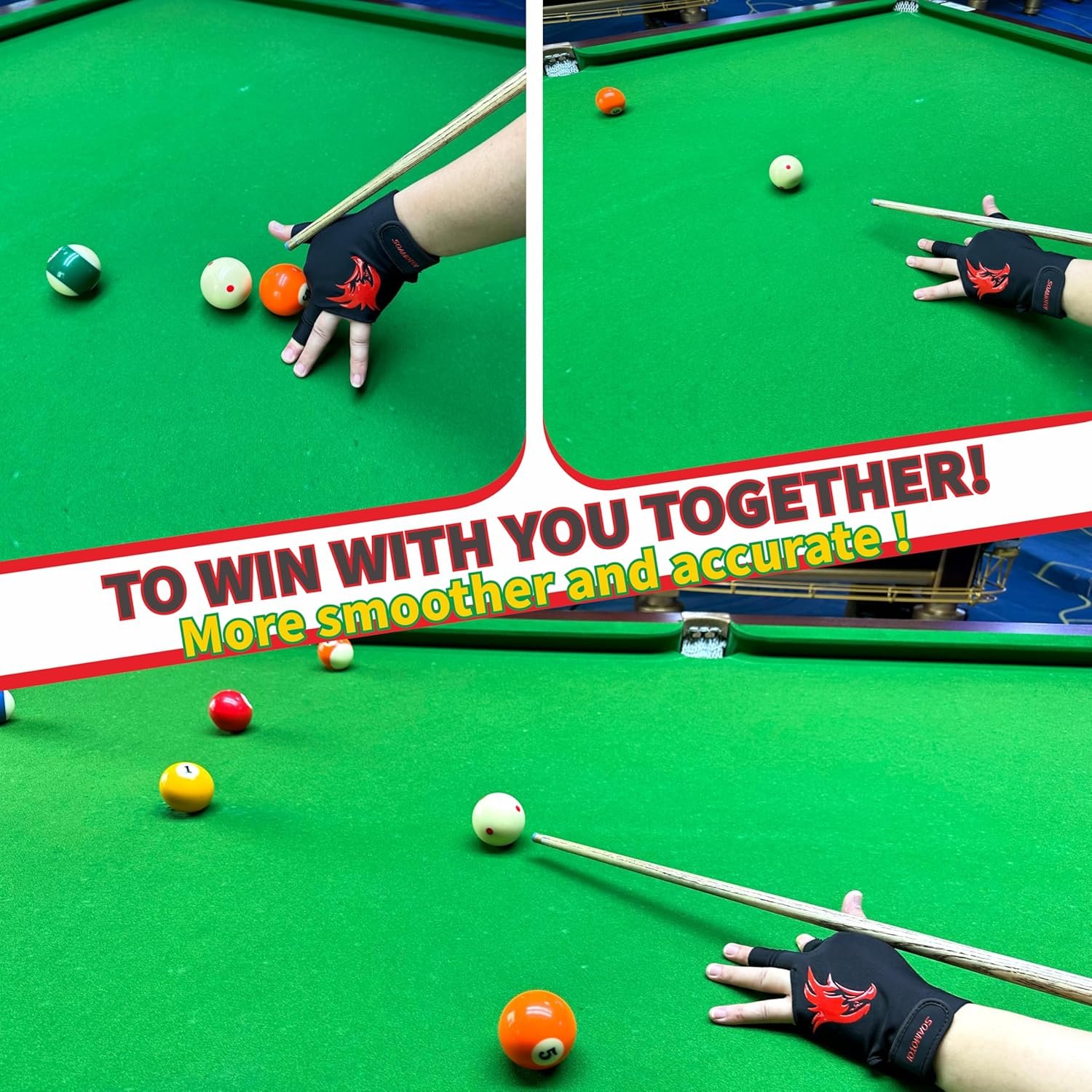 【Stylish Appearance】The pool cue glove with exquisite silicone logos along with fashion color matching, make you feel happier when you playing.