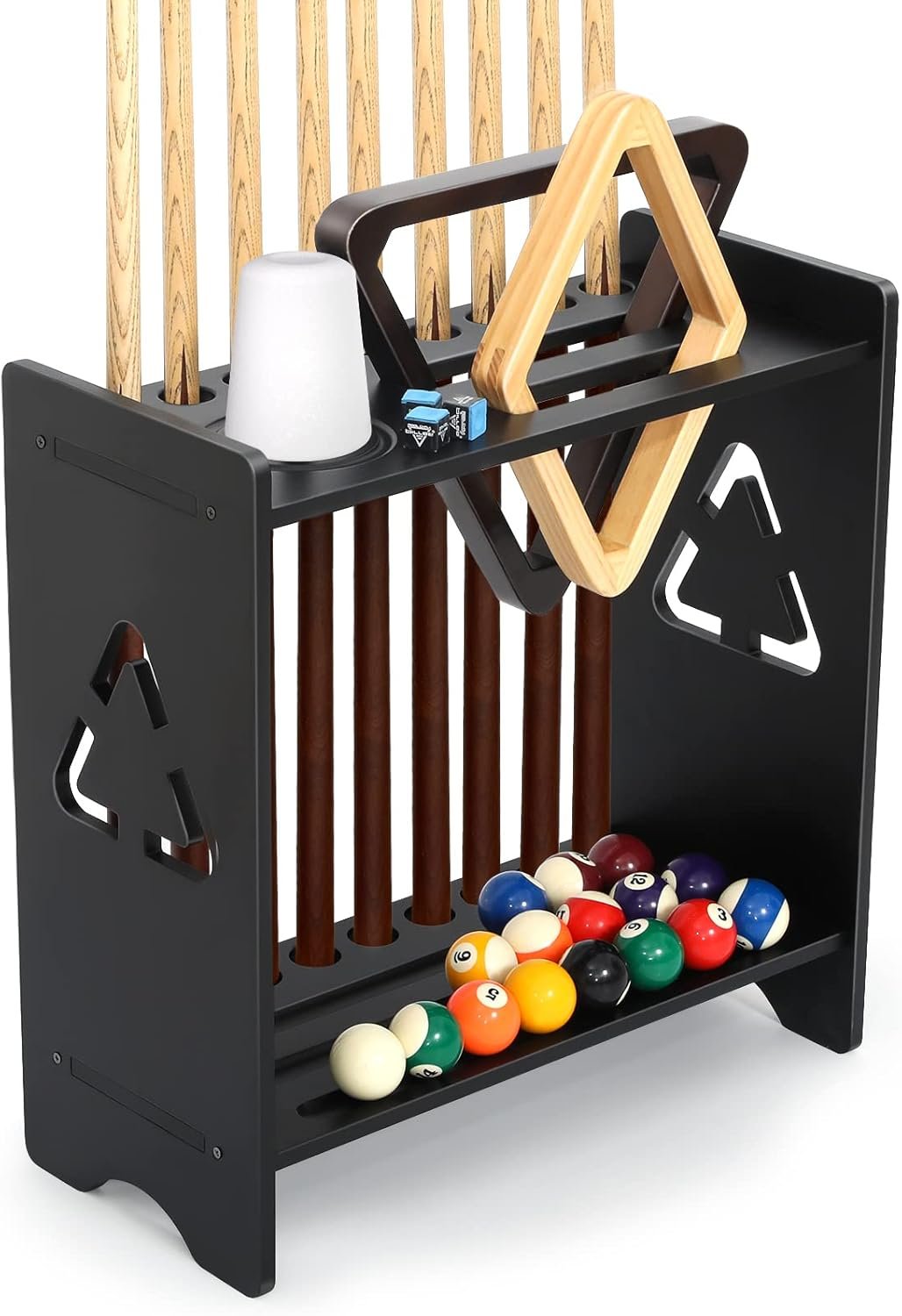 ALL IN ONE POOL CUE RACK – This pool cue rack can hold 9 cue sticks, a set of balls, and 2 spaces to put triangles or diamond billiard ball racks. There is a space dedicated to the cone chalk and extra space to hold chalk, a brush, or whatever else.