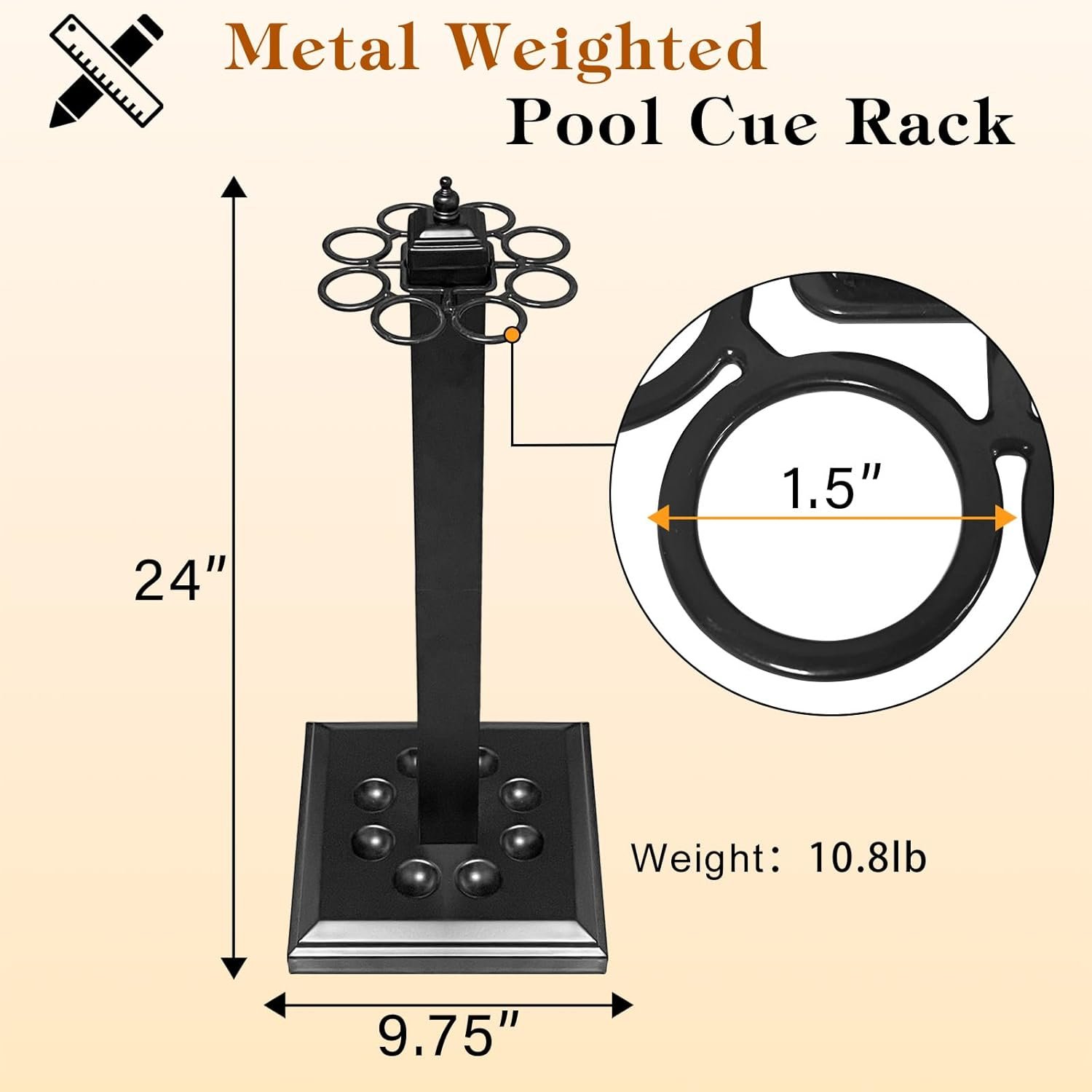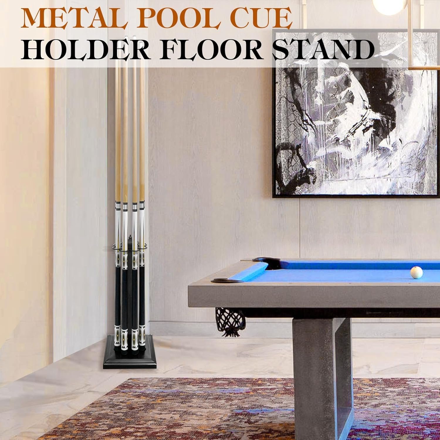 WEIGHTED BASE :Enhance the security of your pool sticks with heavy duty metal pool cue holder floor stand. The grooves designed specifically for cue sticks provide added stability. This freestanding pool cue stick holder serves as a great display solution, keeping your cues neatly organized and out of the way when not in use.