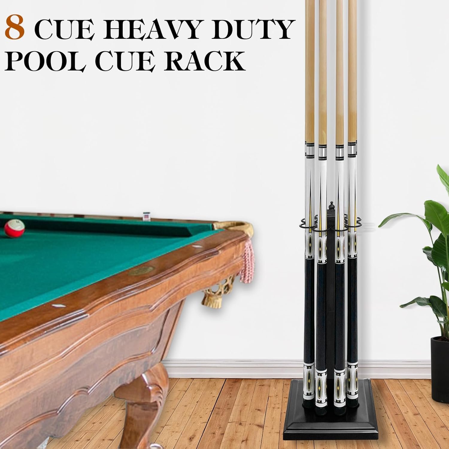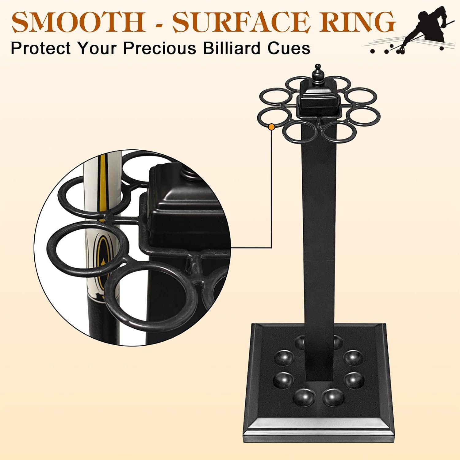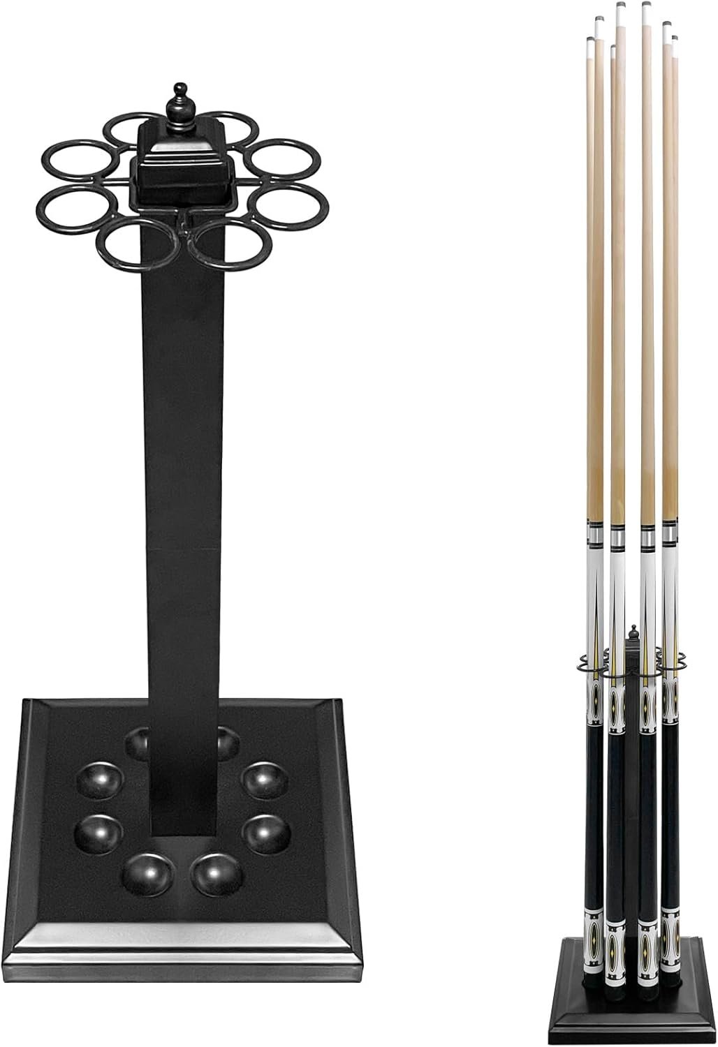 MAKE YOUR EASY ACCESSY TO POOL STICKS: Designed to accommodate up to 8 billiard sticks, this cue stand keeps your favorite cues neatly organized and easily accessible whether for use at home, tournaments, or in bars. The smooth rings provide scratch-free placement for your precious pool cues, providing added protection.