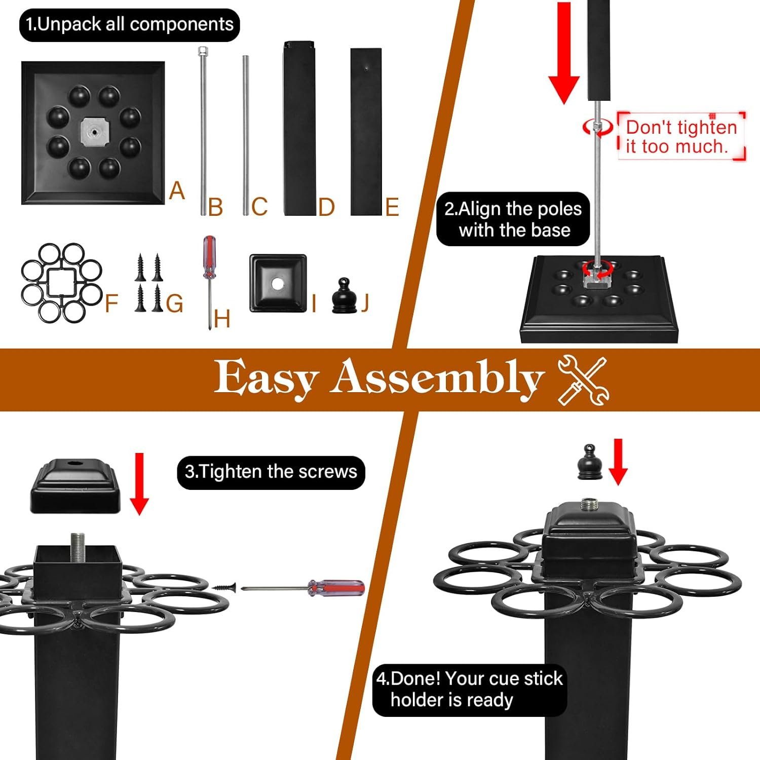 MOUNT POOL STICK HOLDER IN MINUTES:The package includes all the necessary assembly hardware, and no additional tools are required. With a simple and straightforward installation process, you’ll have your pool stick holder ready to use in no time.(Note: Cues are not included.)