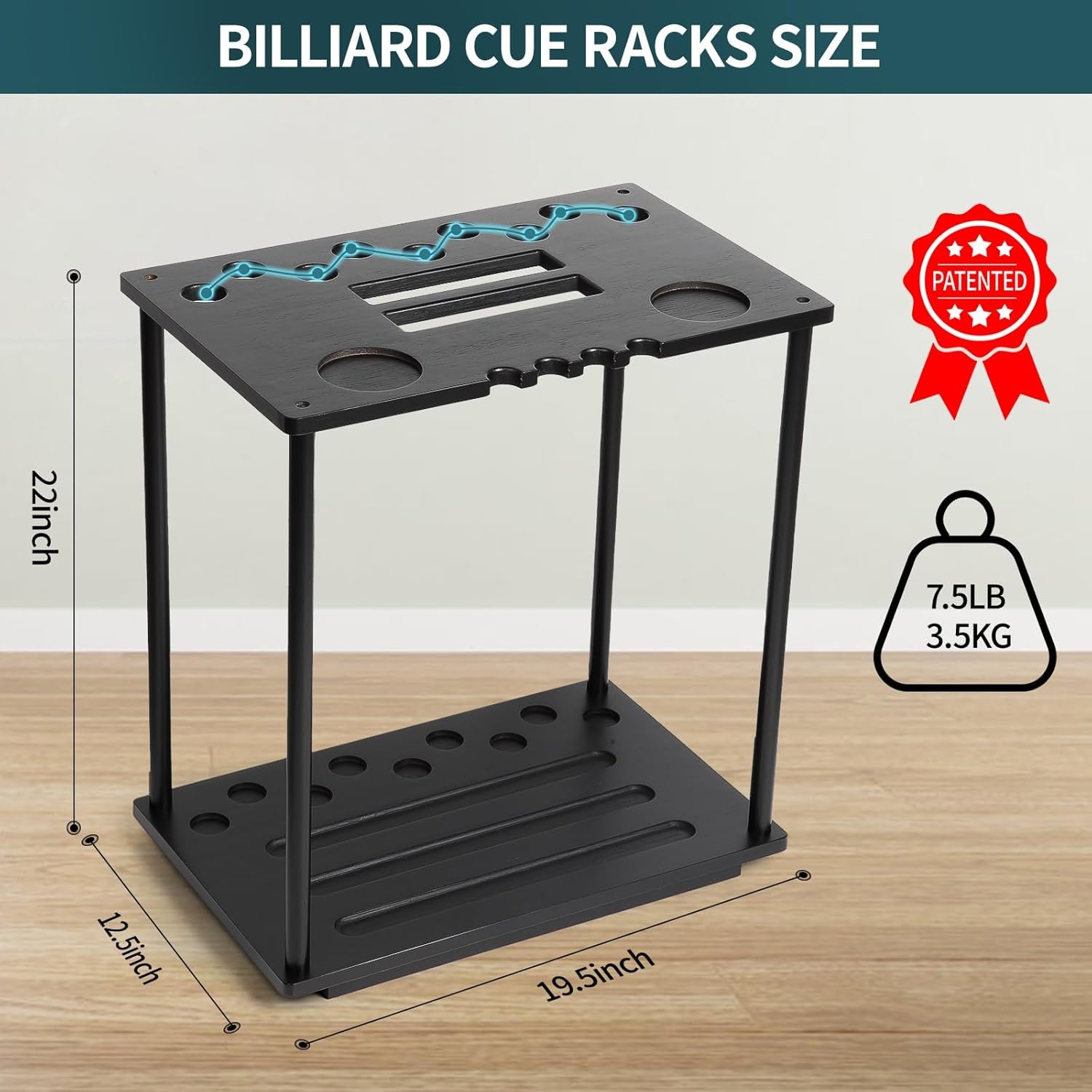 PERFECT SIZE: The pool stick rack is designed by the floor stand,size:19 * 13 * 21inchs,weight:7.5LB/3.5KG. (This billiard cue rack do not require punching and will not damage walls)It is very suitable to be placed at home, in game rooms, bars, clubs, billiards rooms, billiards halls, leisure rooms, restaurants, etc.