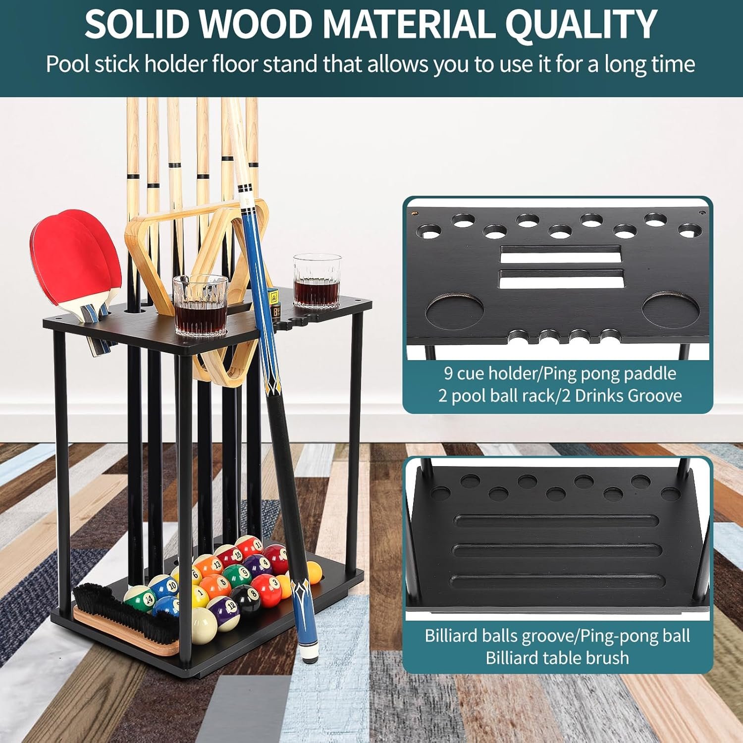 Pool Stick Holder, Pool Cue Holder Floor Stand or Ping Pong Paddle Holder Holds 9 Cues, 100% Solid Wood Billiards Pool Cue Rack, Pool Table Accessories for Game Room, Home, Black