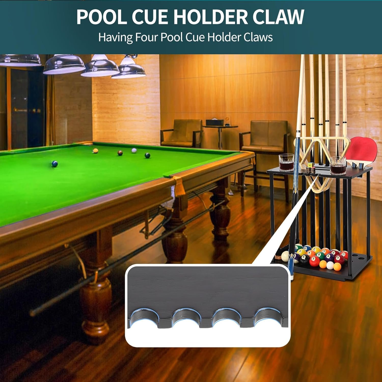 POOL CUE STICK CLAW DESIGN: This billiards pool stick holder has the function of pool cue holder claw. You can quickly lean the pool cue stick on your hand against the pool stick holder during breaks or emergencies, which will allow you to play happily in the pool room.