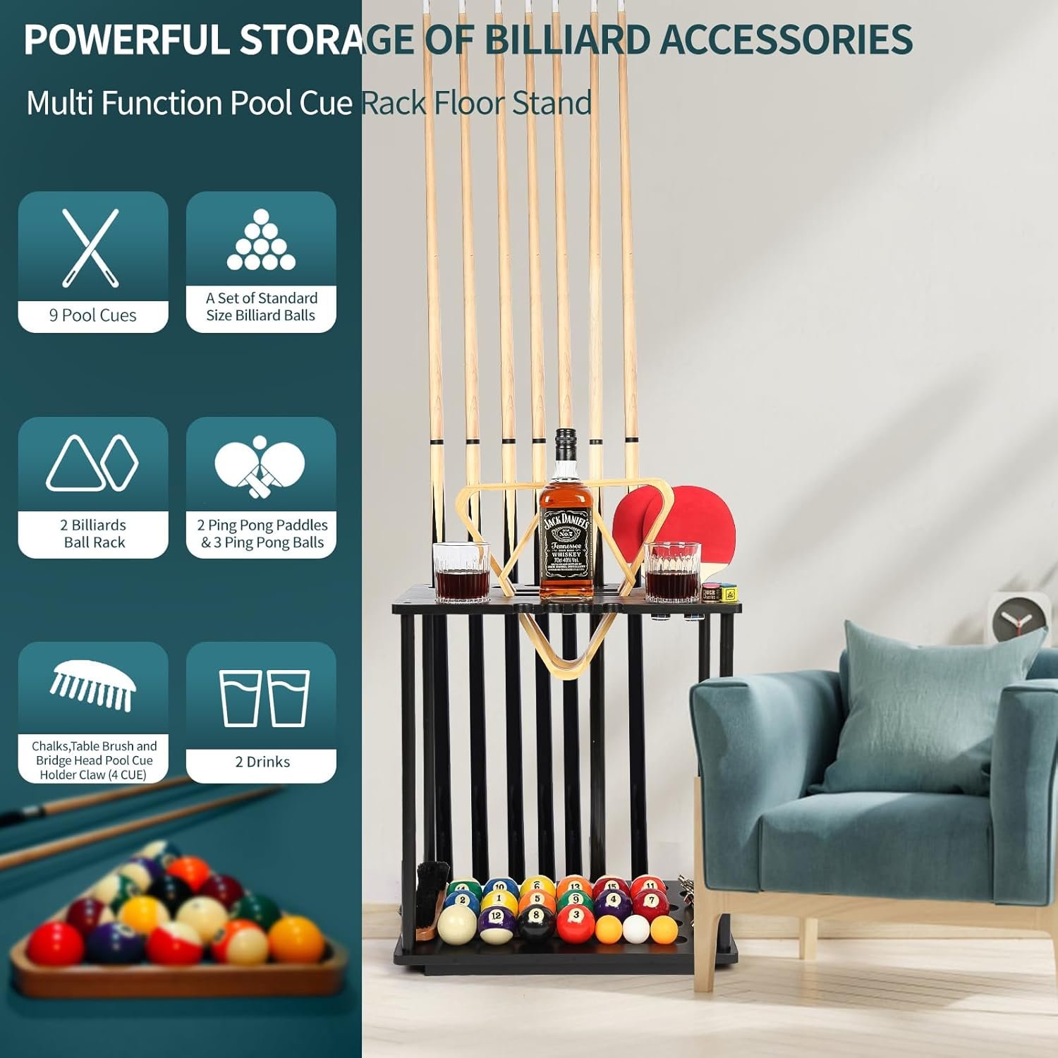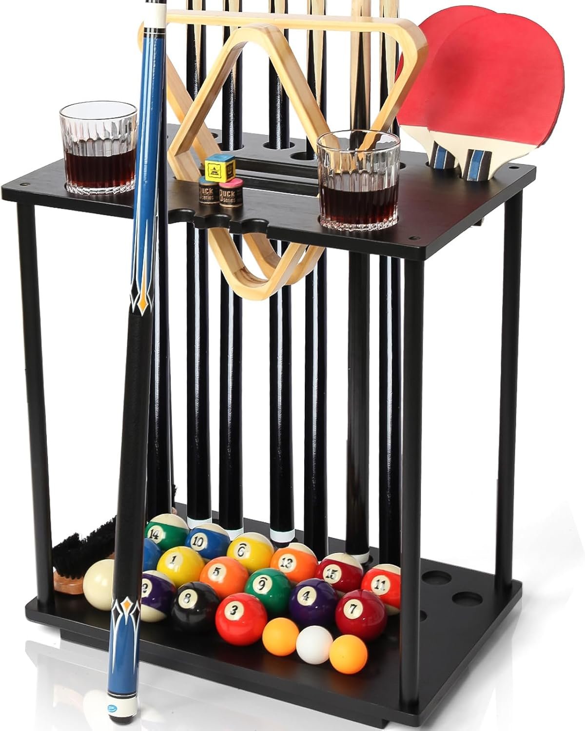 POOL STICK HOLDER FLOOR STAND: Our Xnwouco pool cue holder floor stand has great compatibility. It can accommodate 9 pool cue sticks, a set of billiards, 2 wine glasses, and 2 spaces to put triangles or diamond billiard ball racks, as well as additional space for hold tank, pool table brush, or whatever else. At the same time, it can also store ping pong pads and ping pong balls, and this pool cue rack and ping pong pad holder can keep your game room organized.