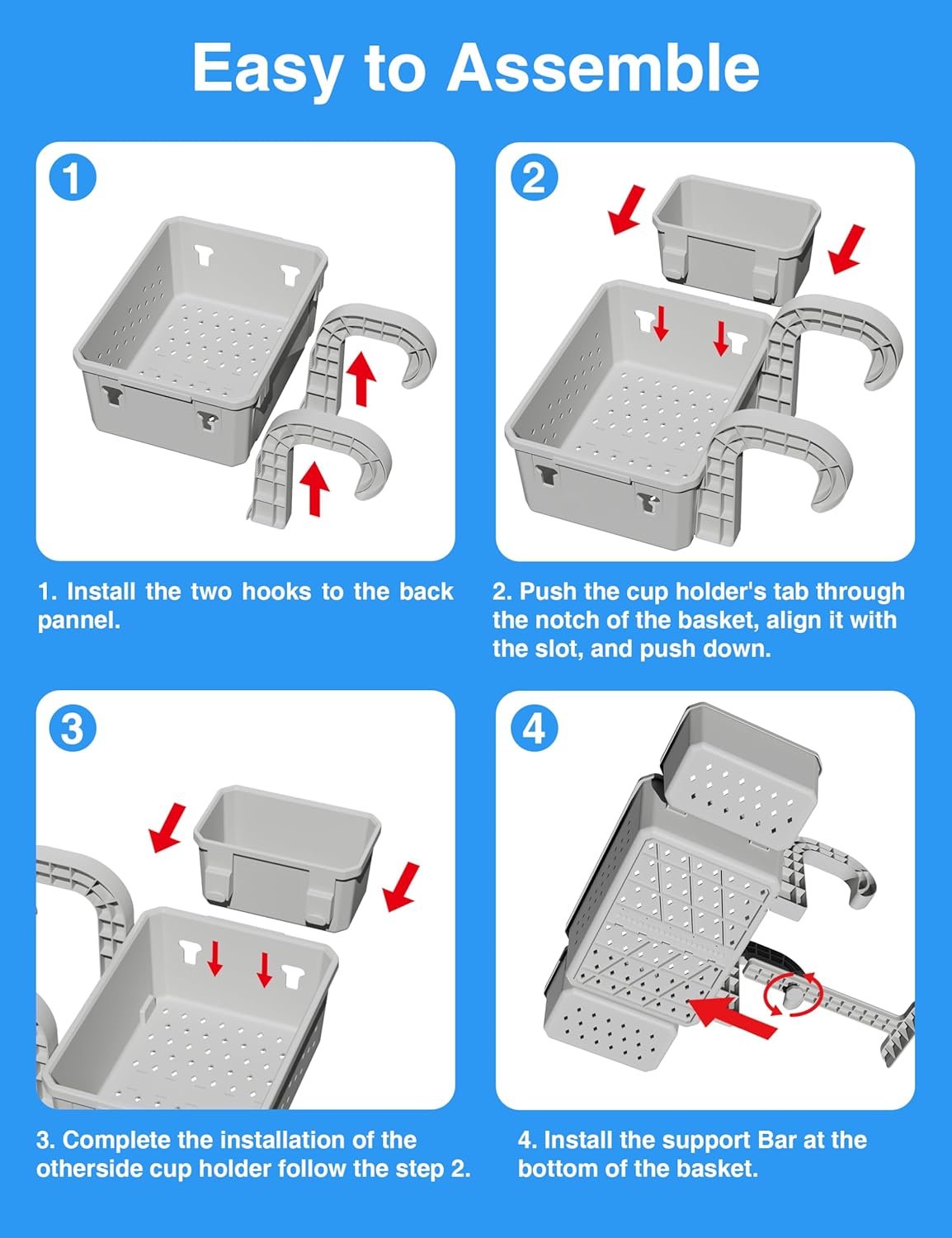 Large Storage Space: A storage basket with dimensions of 10.62×7.83×4.33 inches, two cup holders with dimensions of 6.85×4.17×3.45 inches, and a weight capacity of up to 10 pounds, providing ample storage space and easy portability. The package includes: 2 storage baskets, 4 cup holders, 4 large hooks, and 2 adjustable support rods
