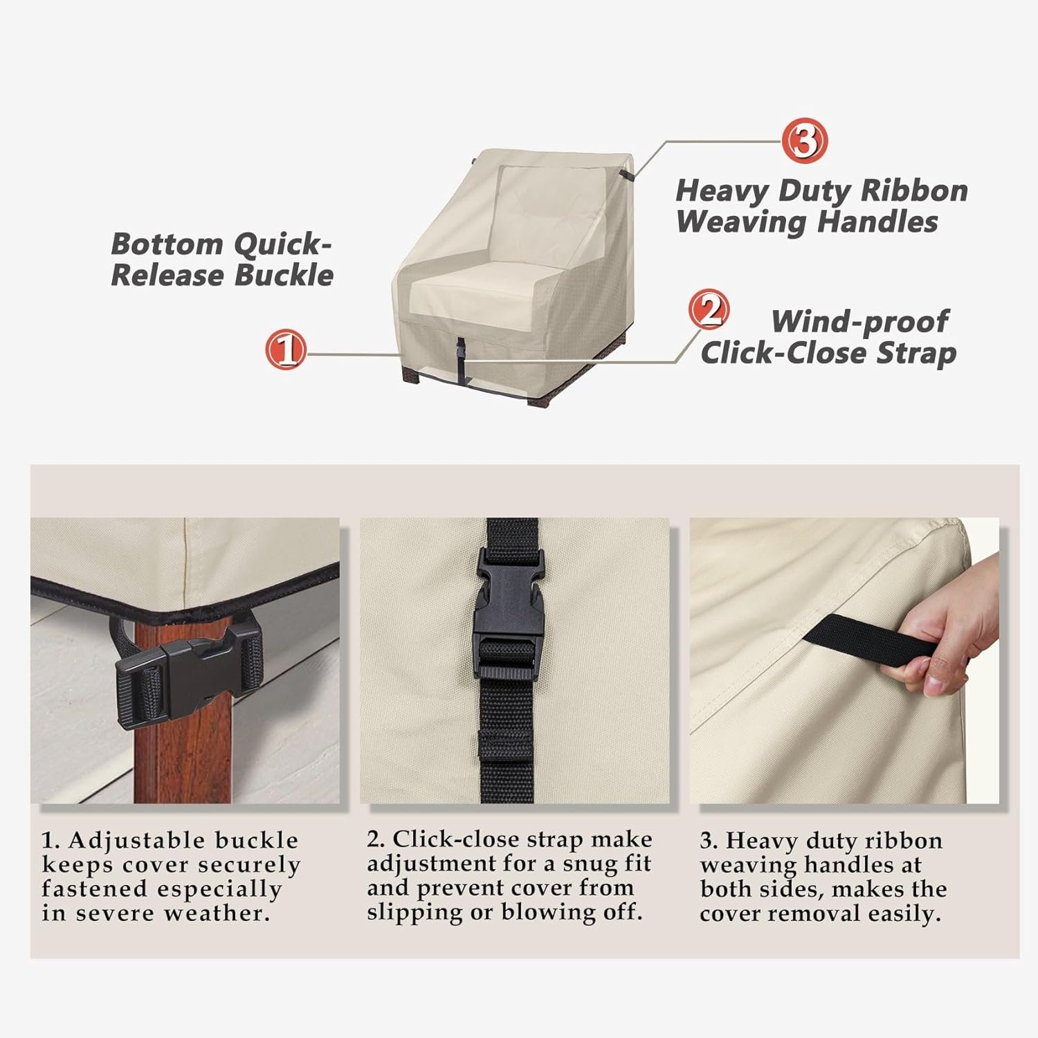 Easy to Use – Heavy duty ribbon weaving handles make the cover easy to install and remove. No more to move your outdoor chair under shelter each time. Put the cover on will keep it look like new.