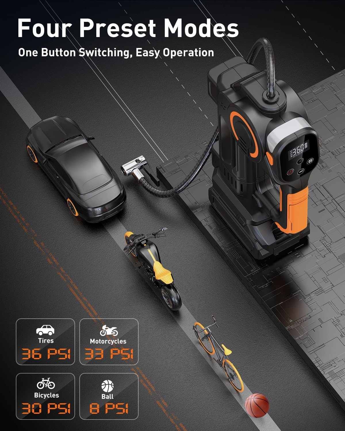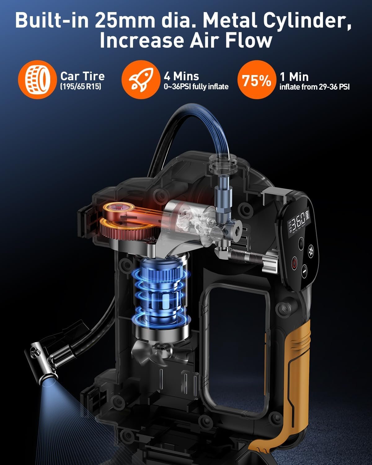 Portable Air Compressor – 160 PSI, 21V Battery, LCD Display, LED Flashlight, Triple Cooling System, 4+N Inflation Modes, Orange, Car, SUV, Motorcycle, Bike, Ball Tire Inflator