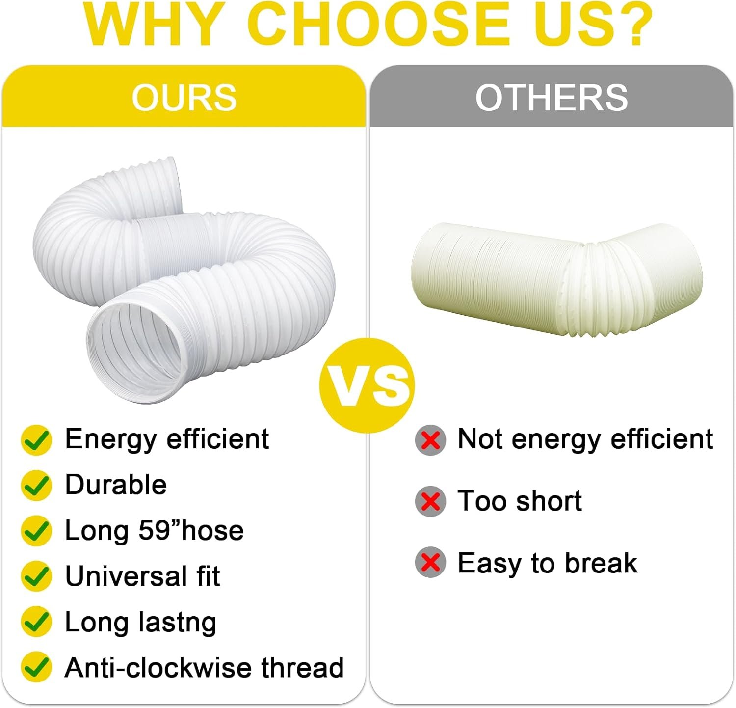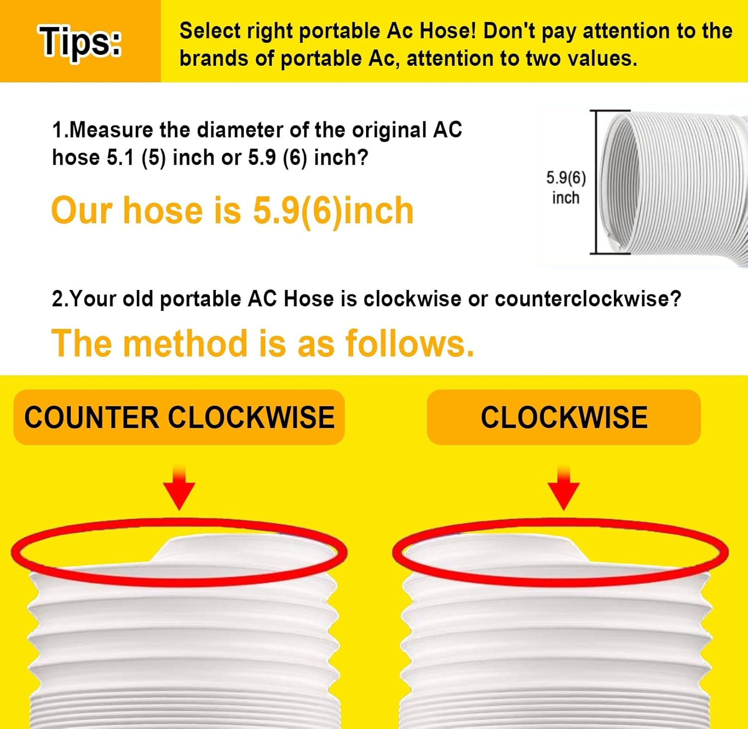 【5.9 Inch Counterclockwise】: Our 5.9 inch portable ac hose is anti-clockwise. Suitable for most portable air conditioners. Please measure and compare your portable air conditioner coupler before purchase (Only 1 pc exhaust hose, no coupler)