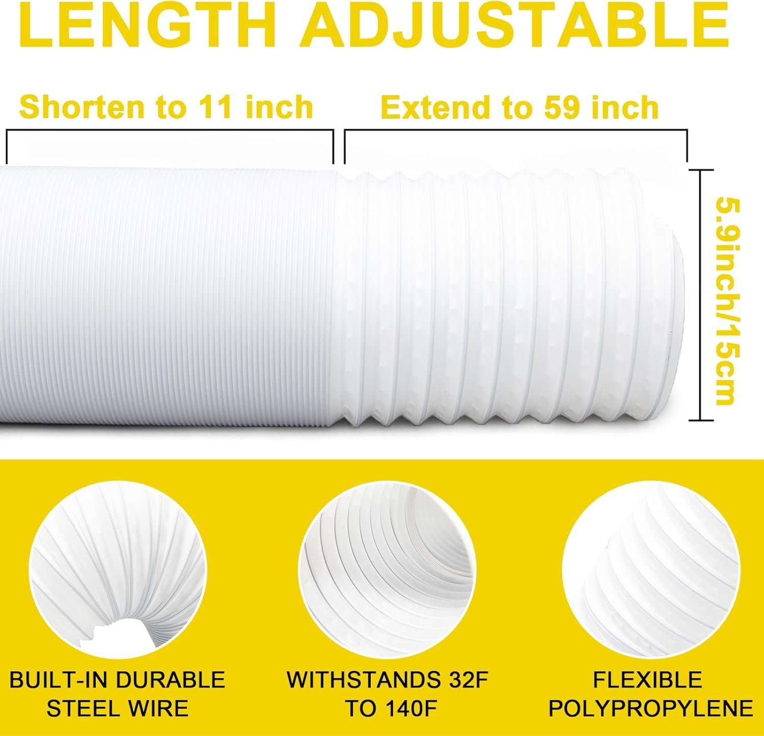 【Extendable up to 59 Inches】: Our ac hose has good telescopic function and flexibility. It can be stretched up to 59 inches, which is more convenient to use in large spaces. It is fully retracted to 11 inches for easy storage