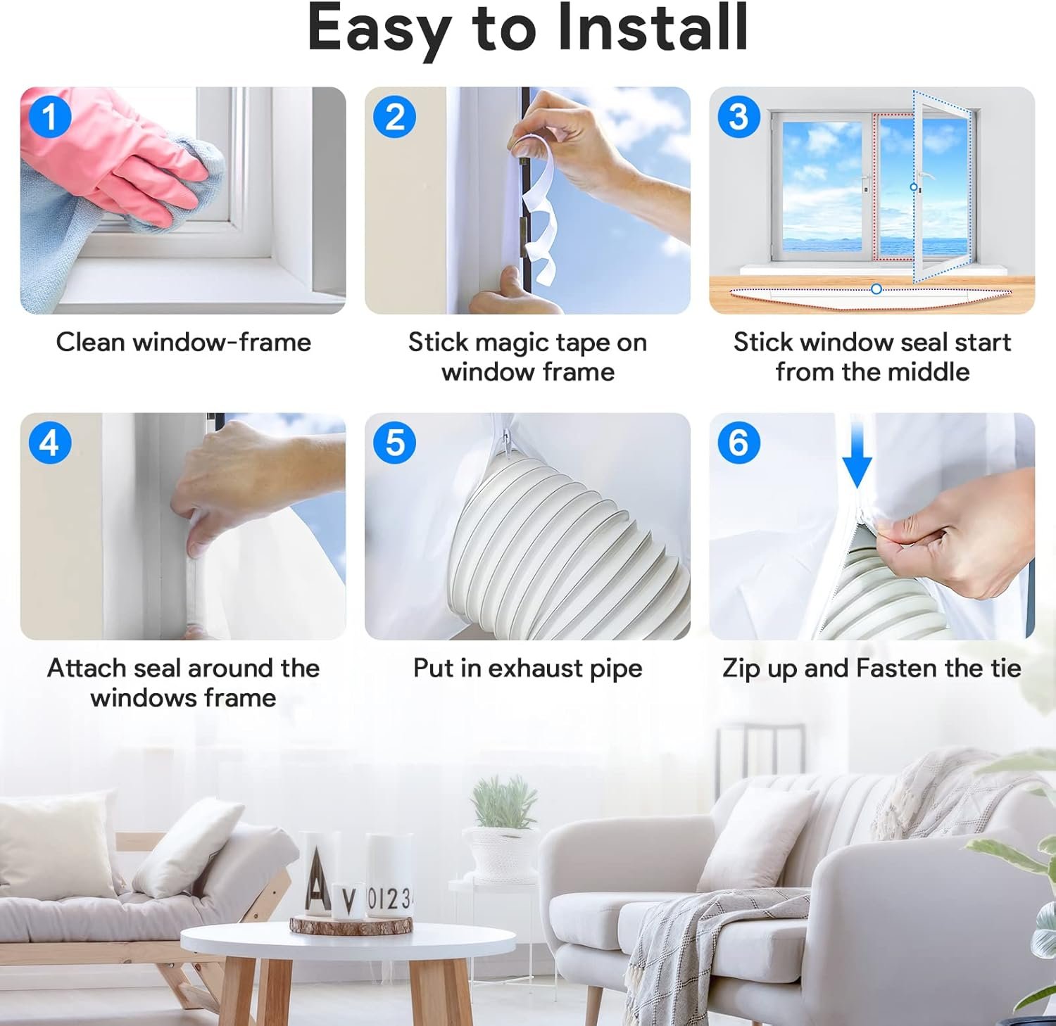 Easy to Install: No drilling and tools required, everything you need is provided by Gruntbear. Simply tape the portable ac window vent kit to the inside of the window frame and to the window, place the AC hose out of the window, zip it up, and secure with a zip tie. You can open or close the window at any time without removing the window seal