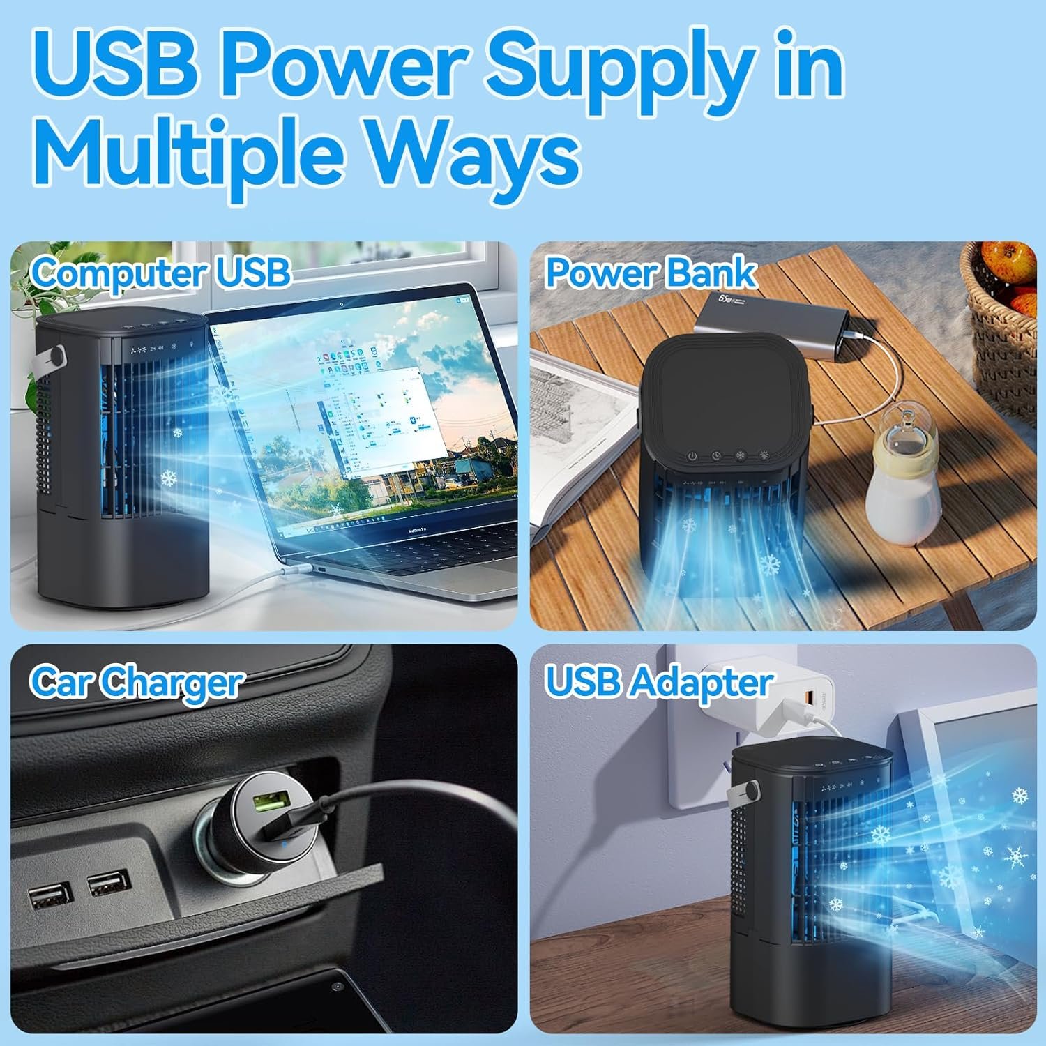 【4-in-1 Portable Air Conditioner】Compact and portable, equipped with a genuine leather handle and a 5V/2A Type-C interface, it can be powered via a computer USB port or a power bank. Its mobility makes it easy to use both indoors and outdoors, such as a tent air conditioner or an air conditioner for the bedroom.