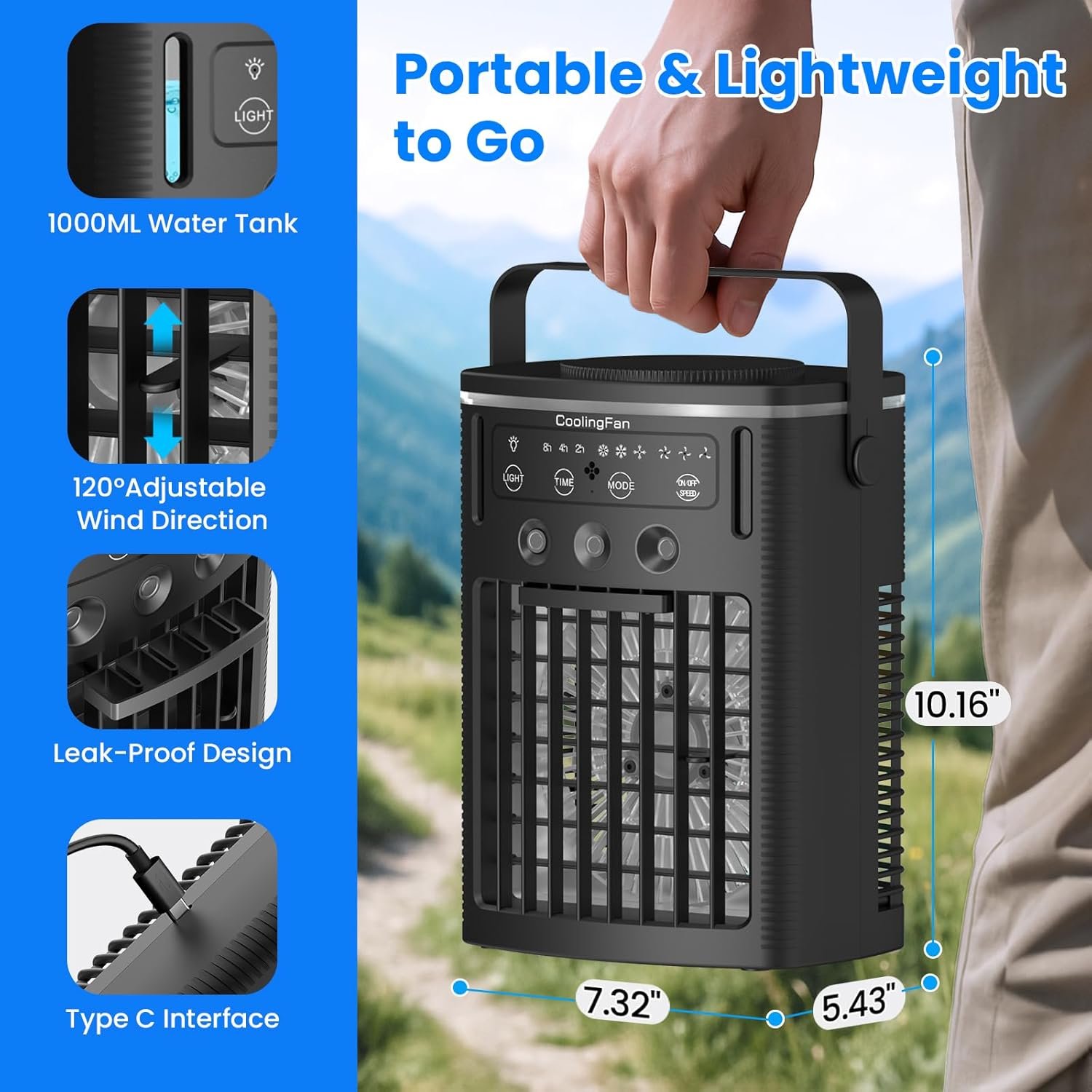 【Energy Saving & Multi-Functional】The personal air conditioner with a 1000ml water tank can work 10 hours when filled up and avoids frequent addition of water, operating at a low energy consumption, much cheaper than running a Freon air conditioner in hot summer days. Ideal for using at homes, kitchens, bedrooms, dorms, desks, offices, and garages, as well as RVs, cabins, outdoor tents, backboard parties, and camping.