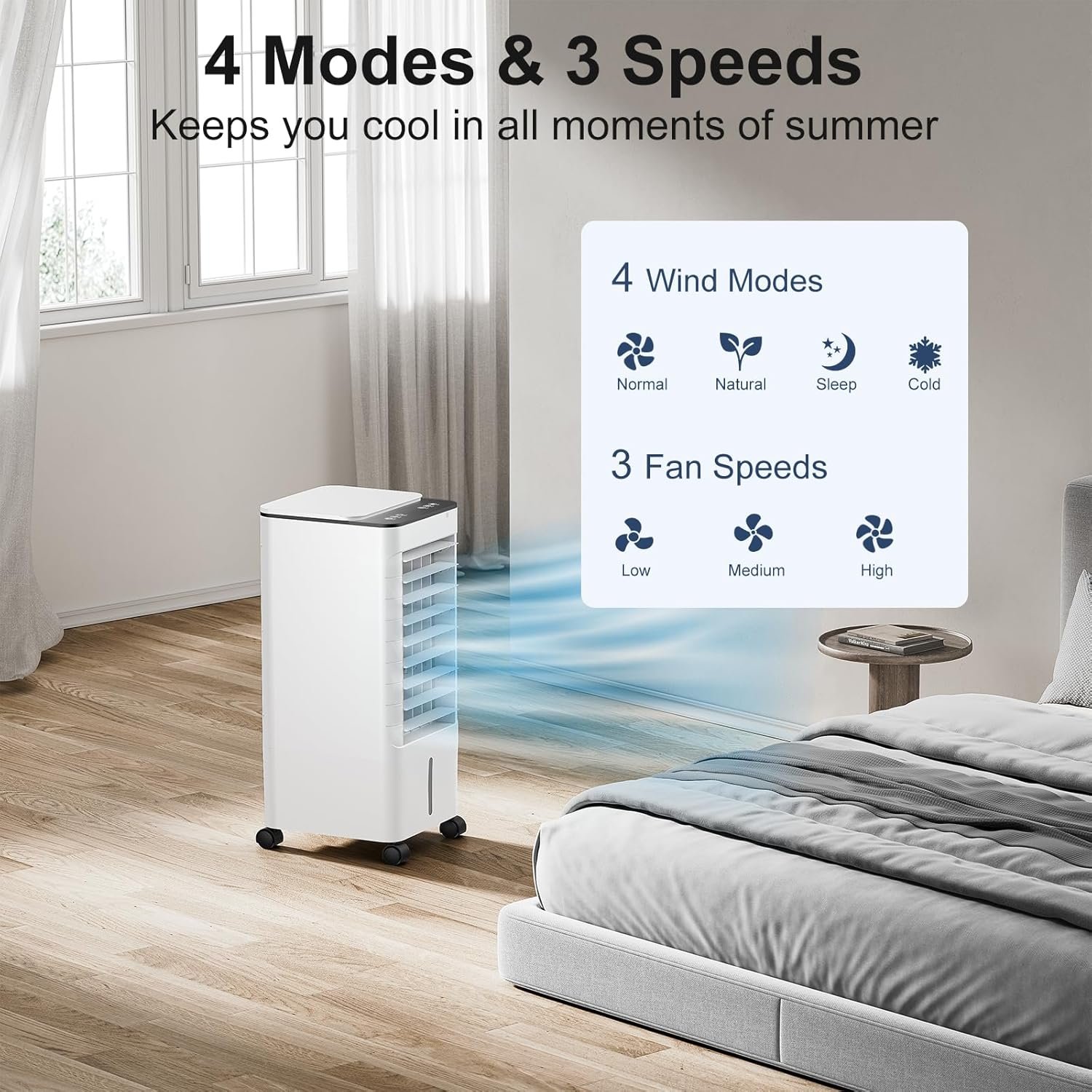 【1.16 Gallon Extra Large Water Tank & 3 Ice Boxes】The 1.16 Gallon extra large water tank can keep the air conditioner cool for up to 6 hours without the need to refill it with extra water.3 ice boxes can be used alternately. Let you feel the cold quickly.