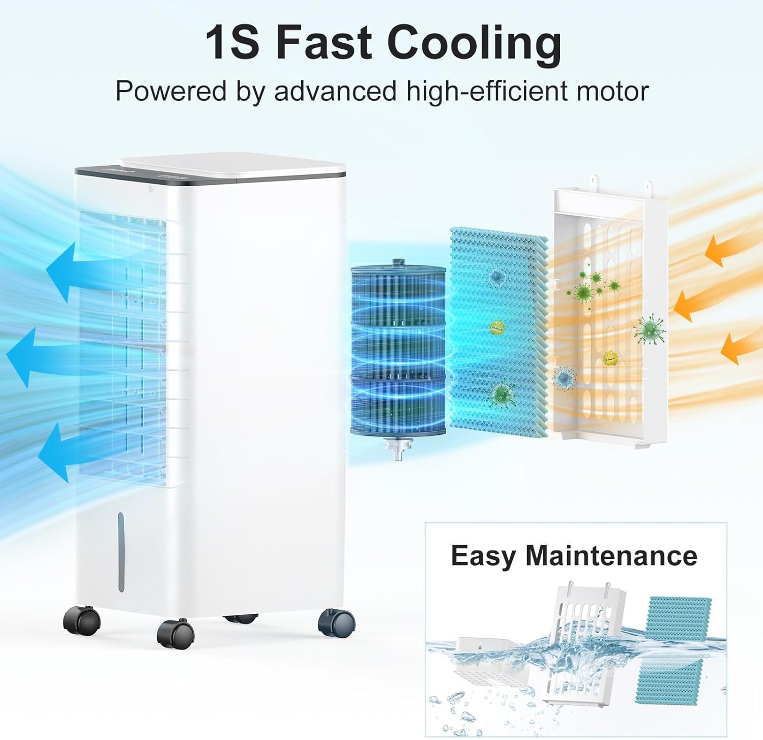 【Advanced Cooling Technology】The BIESQYA Upgrade Swamp Cooler utilizes the latest 2024 cooling technology with a high-performance motor and innovative air duct design. Quickly reduces ambient temperatures by 36-45 degrees Fahrenheit by converting water into ice mist. High-density cooling pads insulate against hot outside air and airborne contaminants. TIPS: Adding a frozen ice box to the water tank enhances the cooling effect.