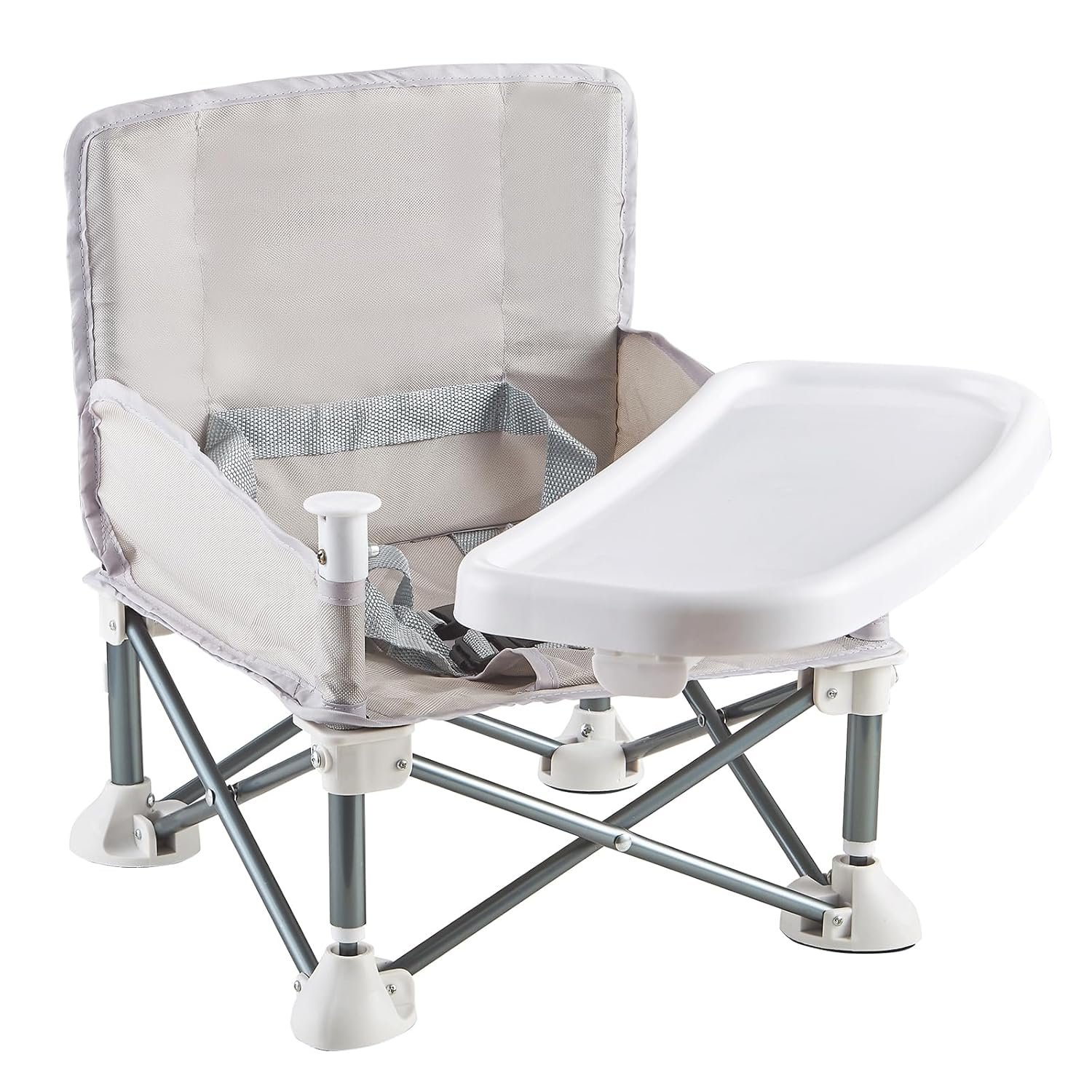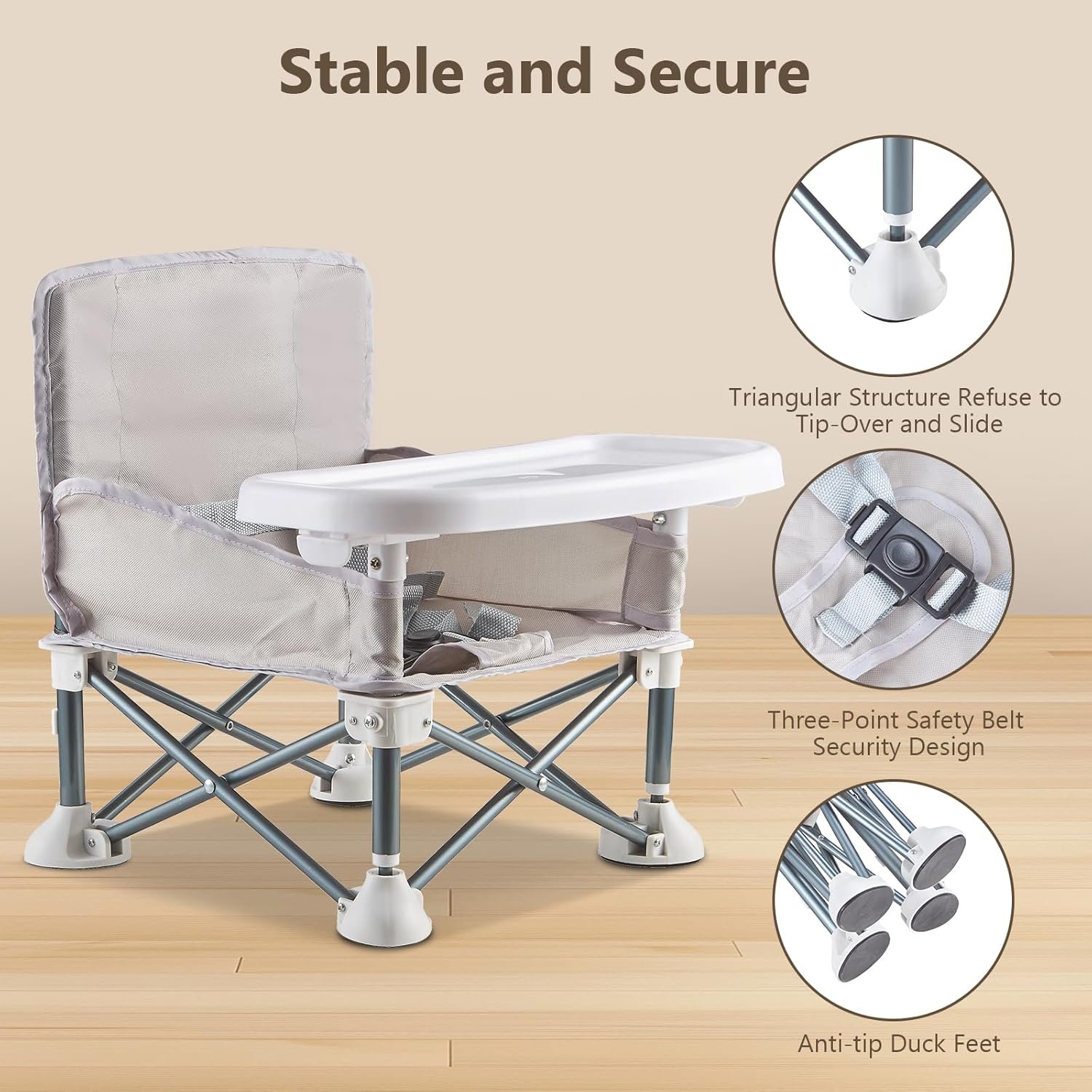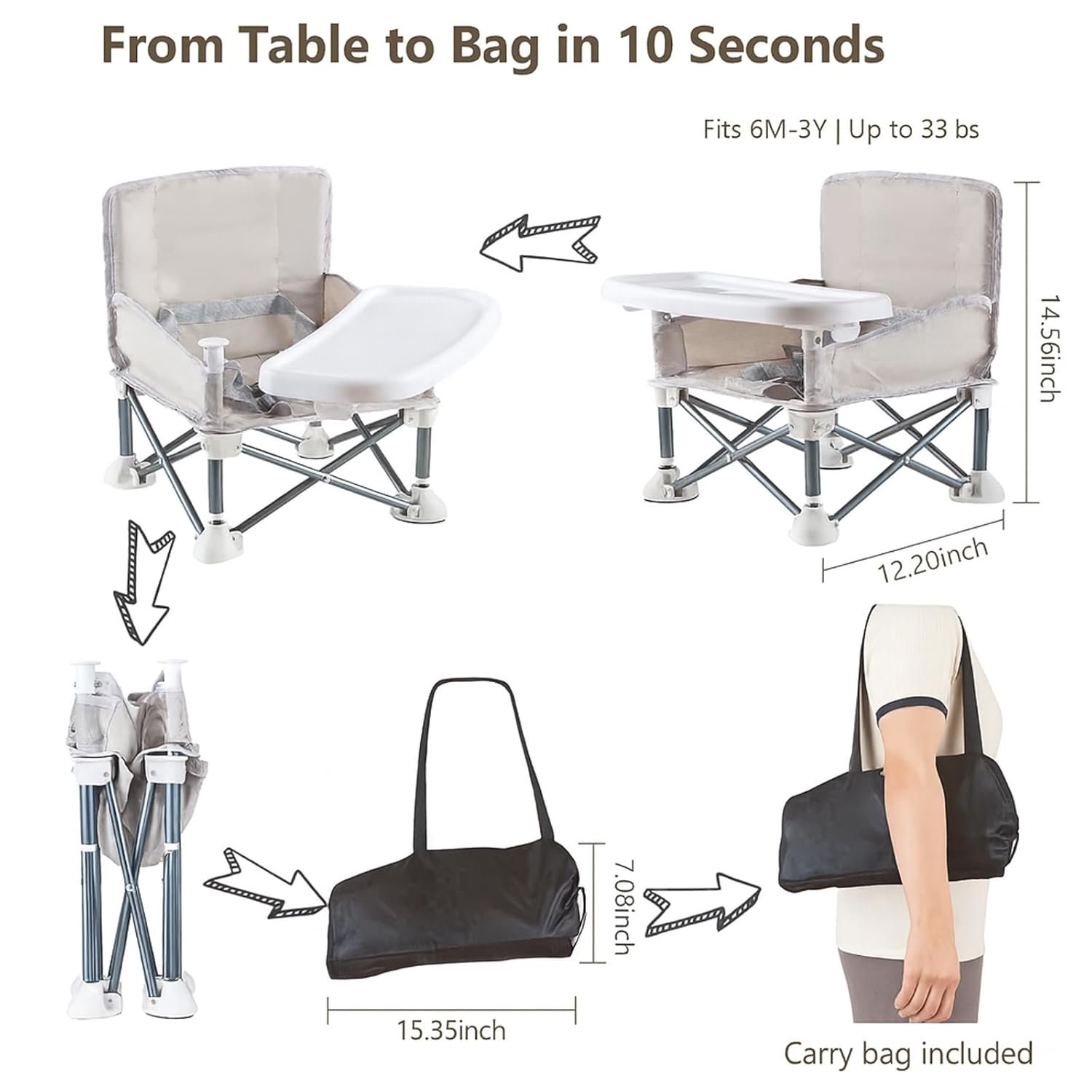 Portable Baby Chair with Removable Tray – Folding Booster Seat for Toddlers 6 Months to 3 Years, Lightweight Travel Highchair for Camping, Beach, Outdoor & Dining Table Use Beige (Grey)