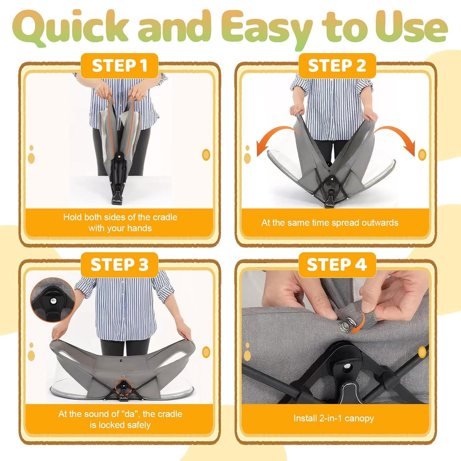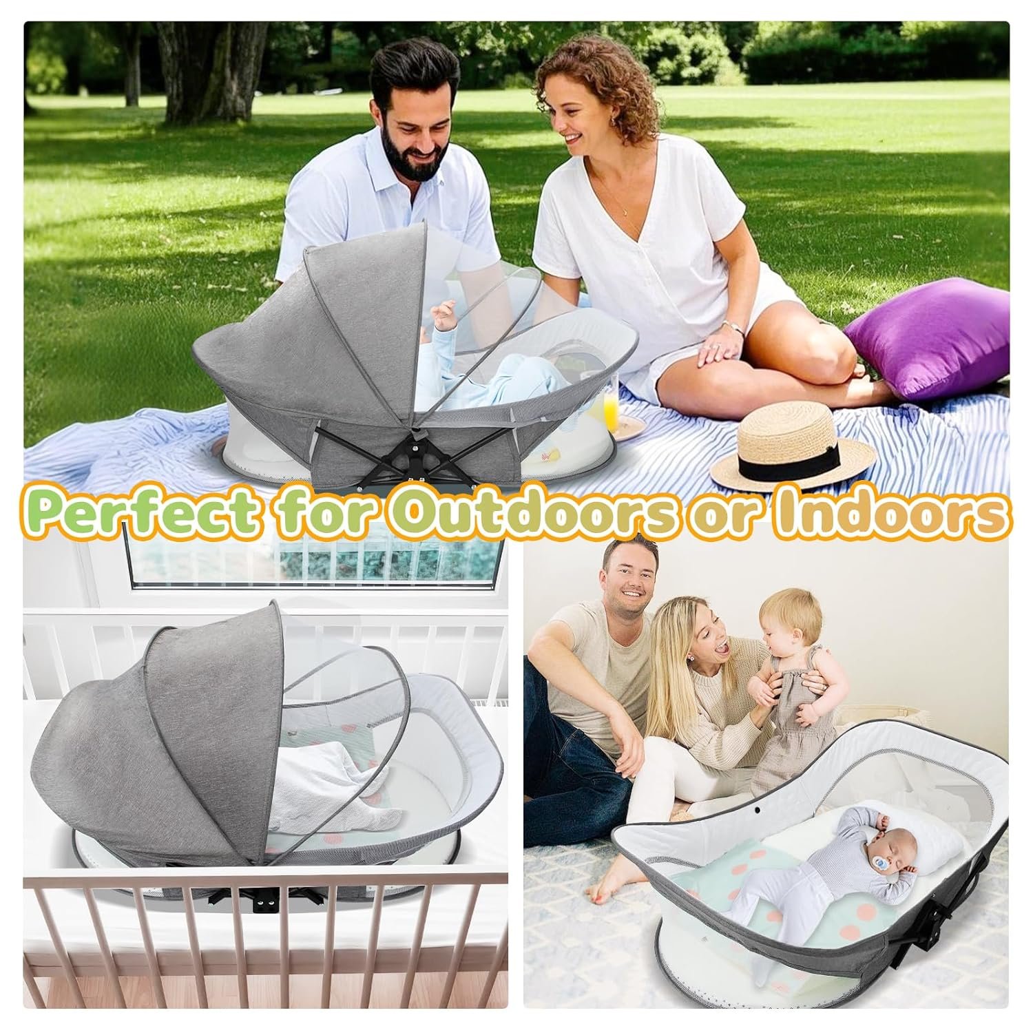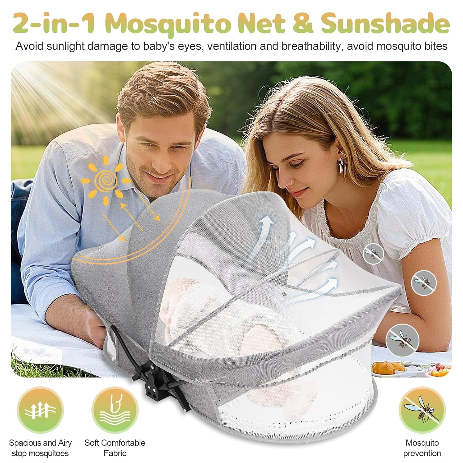 【Breathable & Sunshade】Our baby bed bassinet comes with a 2-in-1 designed breathable mosquito net and sunscreen awning that effectively blocks mosquitoes and light damage, creating a safe and comfortable sleeping environment for your baby. The baby travel bassinet breathable mesh material promotes air circulation, while the sunscreen part protects your baby’s delicate skin and eyes from direct sunlight, allowing your baby to sleep peacefully even in the outdoors.