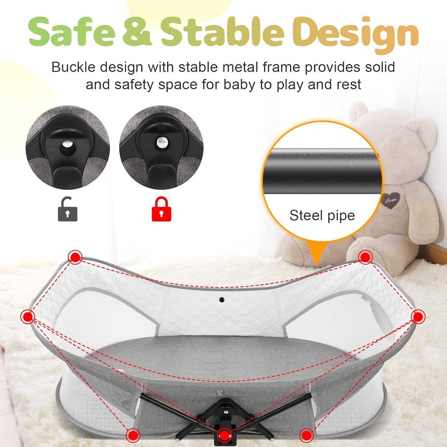【Sturdy & Durable】Our baby portable bassinet is designed with a sturdy and durable steel tube frame to provide all-around safe support for your baby. When the clasps on both sides of the frame make a crisp “click” sound, you can rest assured that the crib is securely locked and ready for use. In addition, the travel bassinet passes rigorous safety tests to ensure that every detail meets high safety standards, giving your baby the peace of mind of a home on the go.
