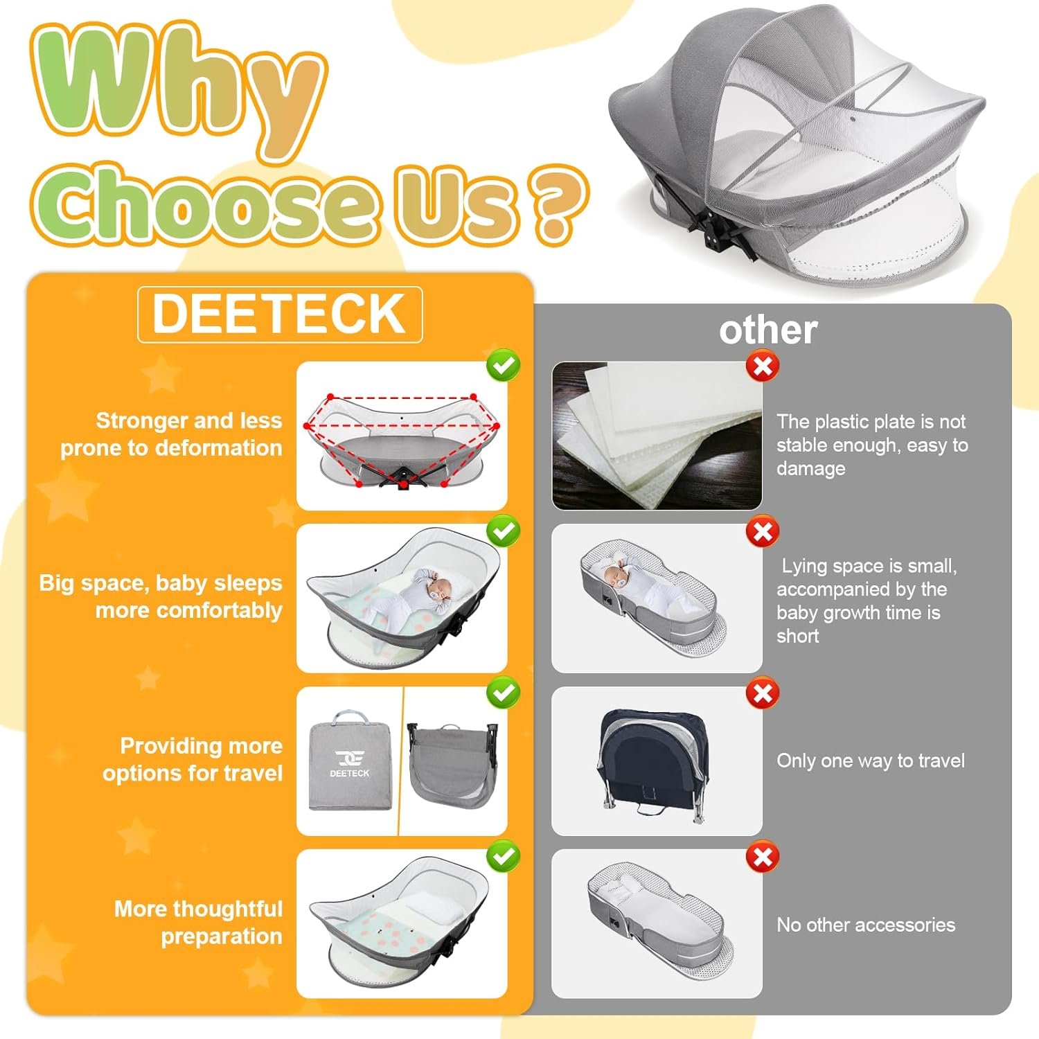 【Washable & Easy to clean 】The mattress and mosquito net of the travel bed for baby are removable for easy cleaning and quick drying. This design allows your baby to enjoy a clean and comfortable environment every time you use it. The sturdy and durable frame and easy-to-clean materials make this baby bassinets for bed an excellent choice for your baby’s long-term companionship.