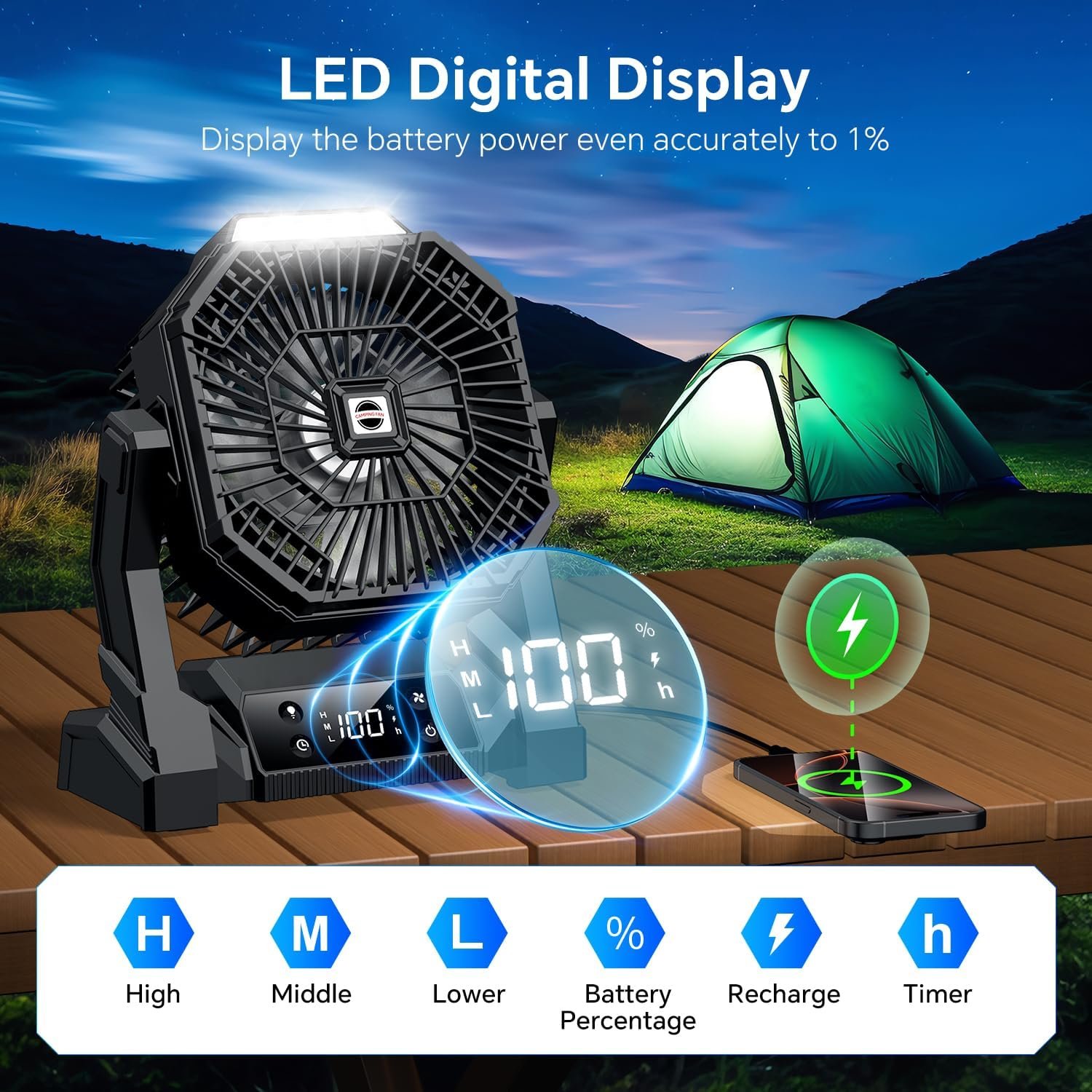 【Digital Display & LED Camping lantern】Outshine ordinary camping fans, this rechargeable model features a bright LED light and digital display that remain clearly visible in both sunlight and dim tent interiors, showing battery level, wind speed, and lighting status. Perfect for camping enthusiasts who prioritize reliable gear.