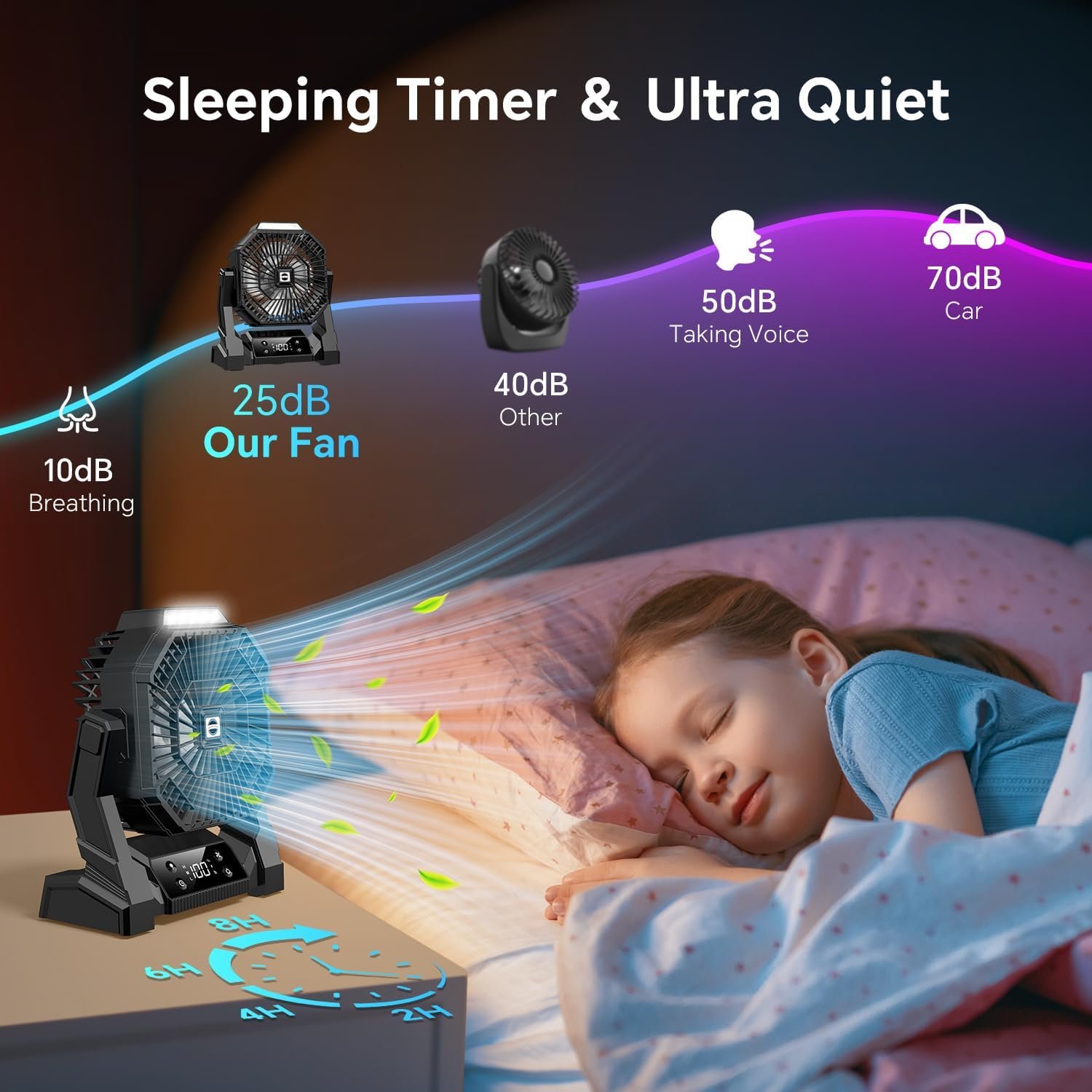【Power Meets Silence 】Switch between a 25dB quiet desk fan for office naps and a 5m/s camping fan for outdoor adventures. The brushless motor + 3 blades handle 3 speeds, while the digital display syncs with settings. Ideal as camping essentials for BBQ nights or RV trips.