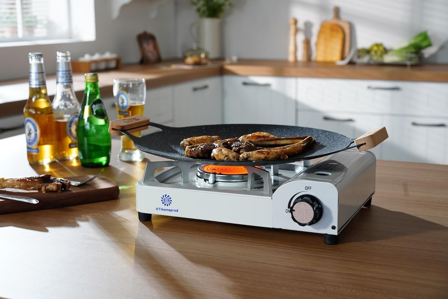 Innovative energy-saving infrared burner, transforms open flames into infrared heat radiation, the butane burner fast heating up time and even cooking, produces 13000 BTU. Reduces gas consumption, and increases thermal efficiency. and more intense combustion, inhibiting the production of harmful gas.