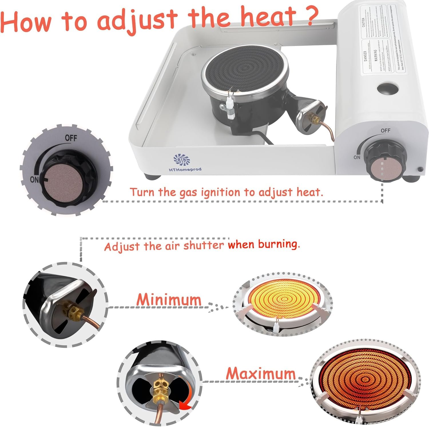 Infrared flame double adjustment, Piezo Electric Ignition can adjust the flame directly. and the air shutter can be adjusted when the butane stove burns to intensify the flame. Heats up fast and efficiently.