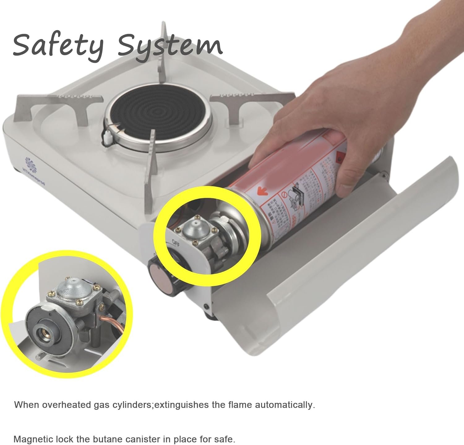 Automatic Safety Shut Off: The camping stove has a Pressure Sensor System for butane fuel; Gas Flow will Cut Off the mechanism when detecting overheated gas cylinders. Extinguishes the flame.