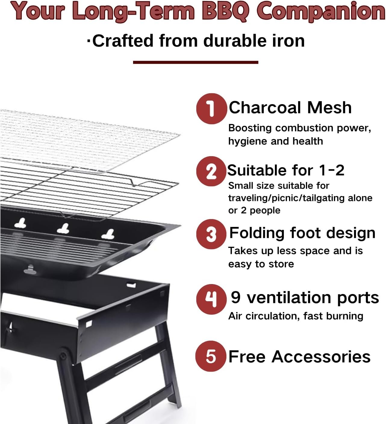 Authentic Smoky Flavor – Unlike gas or electric grills, this portable charcoal grill infuses every bite with that rich, smoky essence that only real charcoal can deliver. Ideal for small families or groups of 1–3, it’s your ticket to delicious outdoor cooking whether you’re camping, picnicking, or hosting a casual backyard gathering