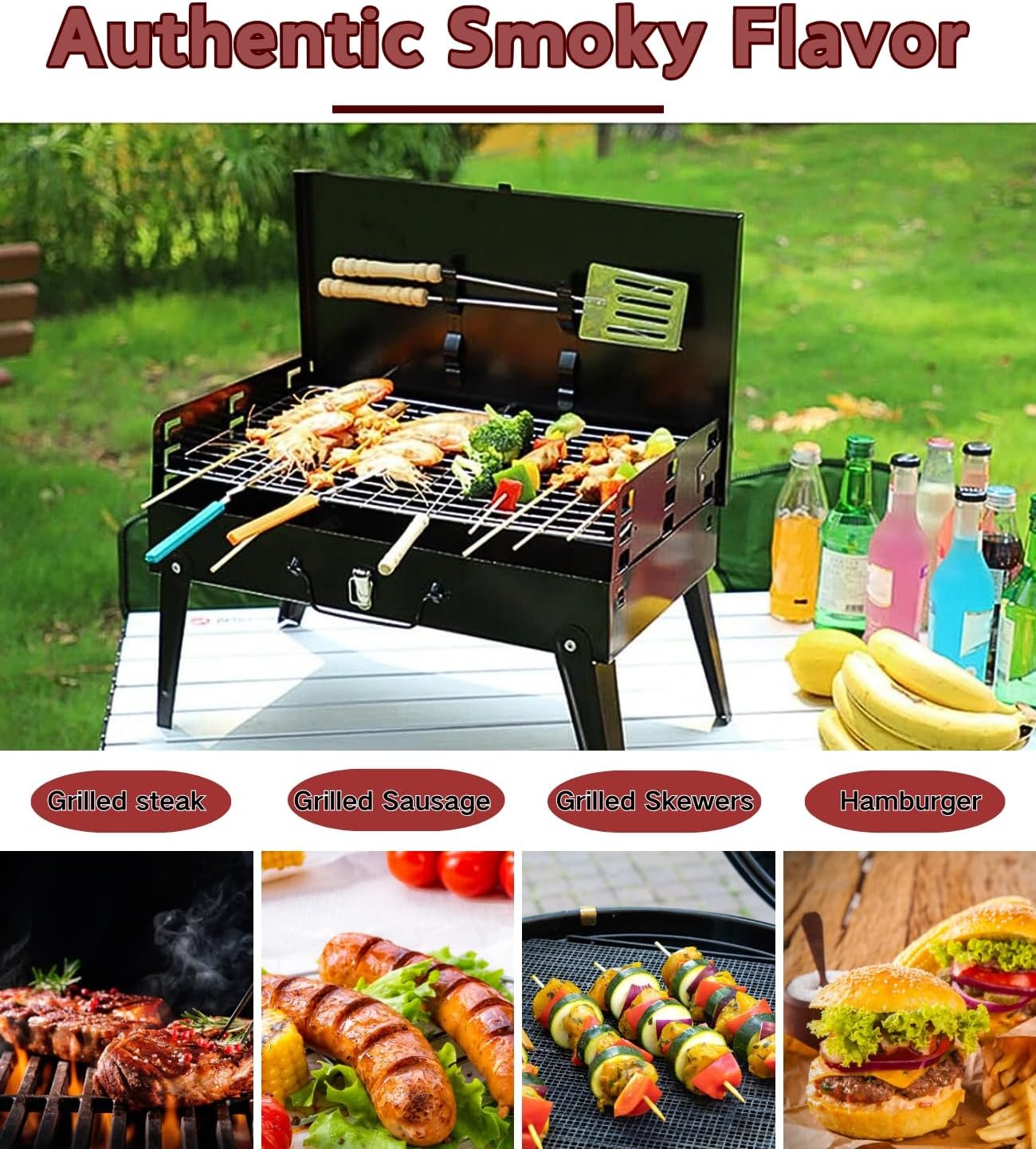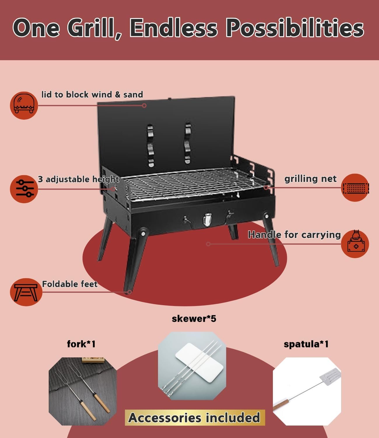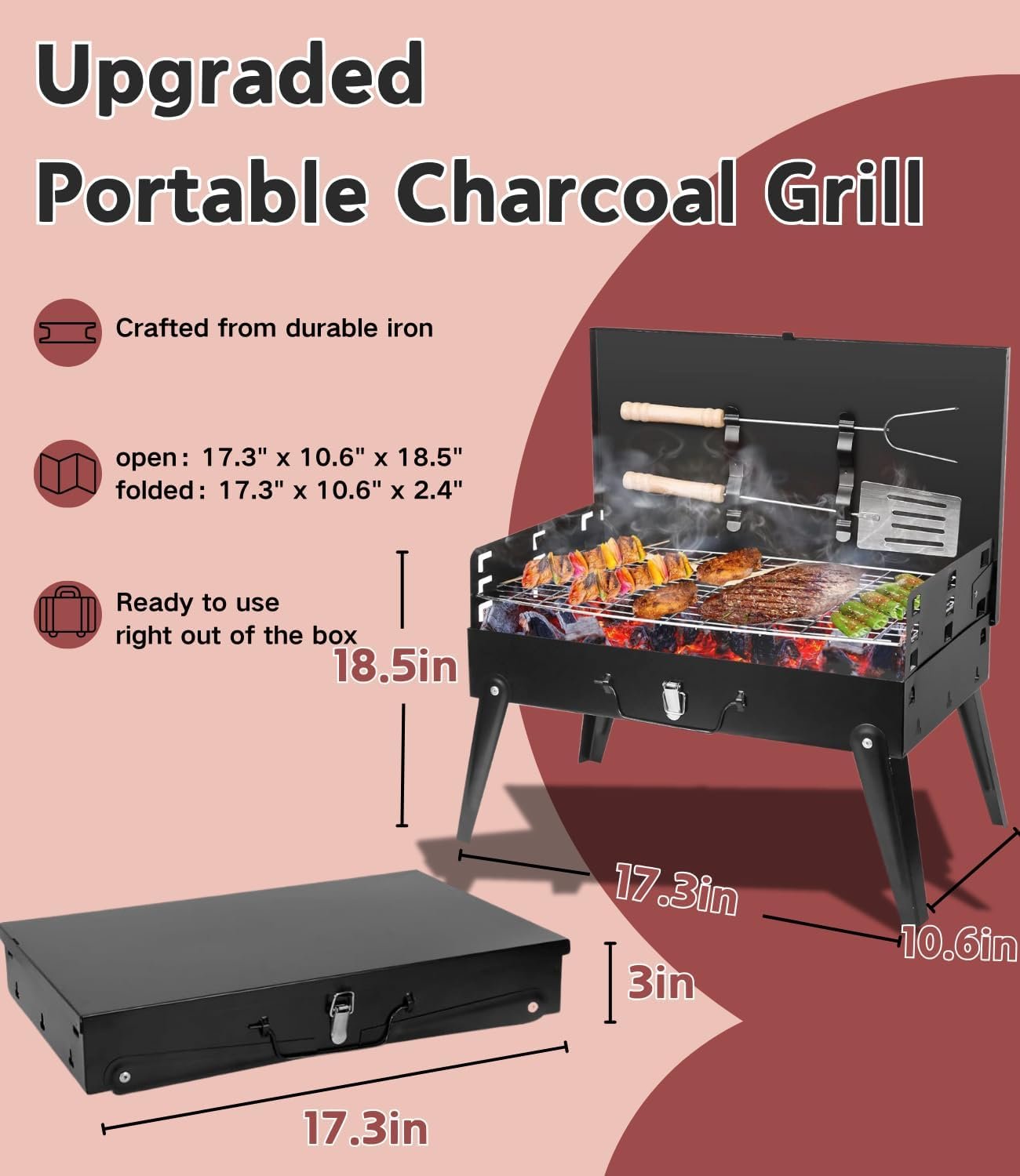 Portable Charcoal Grill Kit – 17.3″ Folding BBQ Grill, Adjustable Heights,5 Skewers, 1 Spatula, 1 Fork, Mini Tabletop Grill, Small Grill Outdoor for Camping, Grilling Backyard, RV, Tailgating, Picnic