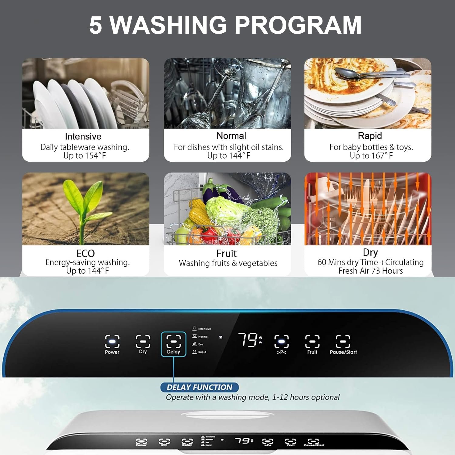 5 Washing Programs: Our tabletop dishwasher comes with 5 washing programs – Intensive, Normal, ECO, Rapid and Fruit Mode. Delay function (1-12 hours optional) allows you to set appointed time to wash.