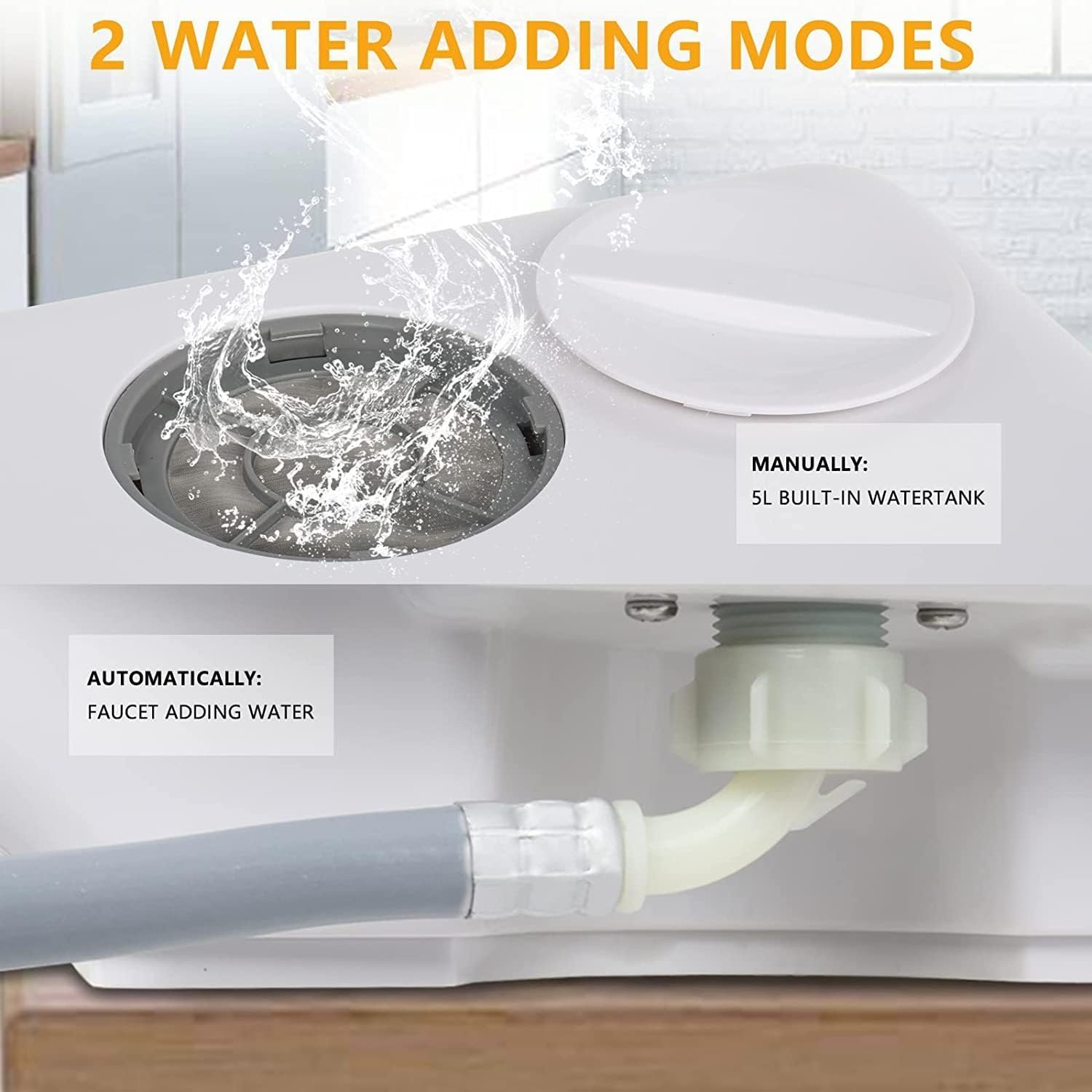 2 WATER SUPPLY MODES: This countertop dishwasher supports 2 water supply modes for you to choose, including water tank mode and faucet mode. In order to maximize portability and storage of the mini dishwasher, you just fill the 5L built-in water tank as needed without a water hook up. And an inlet hose is included to connect the kitchen faucet for direct water supply.