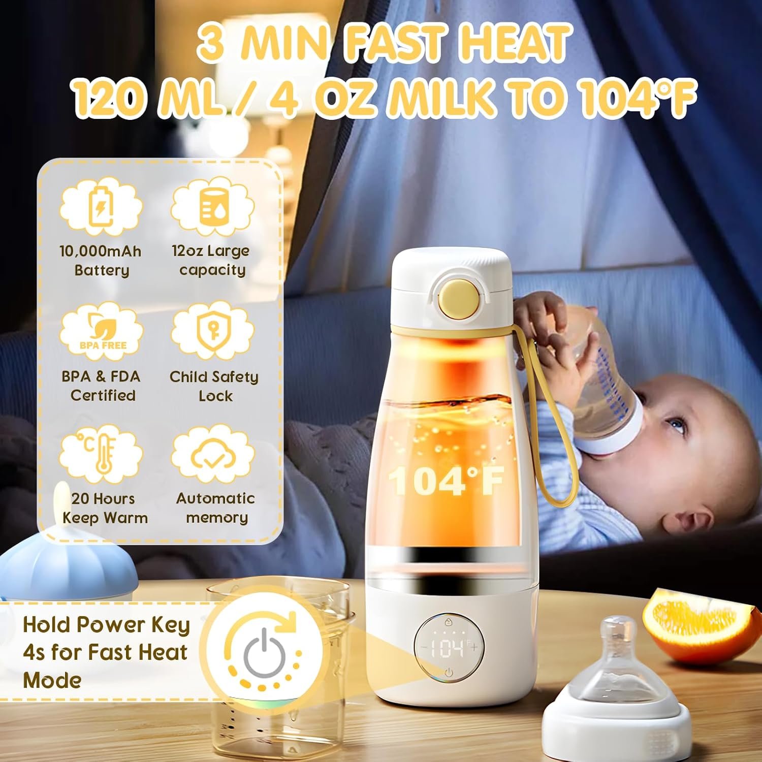 3-Minute Fast Heating Portable Bottle Warmer for Travel: Heat 120ml/4oz of milk to 104°F in just 3 minutes. Perfect for warming breast milk, formula, or water, this portable bottle warmer for travel is ideal for quick nighttime feedings or on-the-go use. (Tip: Hold the power button for 4 seconds to activate fast heating mode)