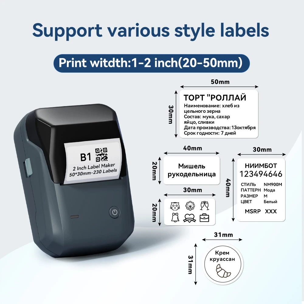 The B1 label maker can print 20-50 mm width label ,can print product labels, address labels, ingredient labels, price labels, clothing labels, jewelry labels etc.