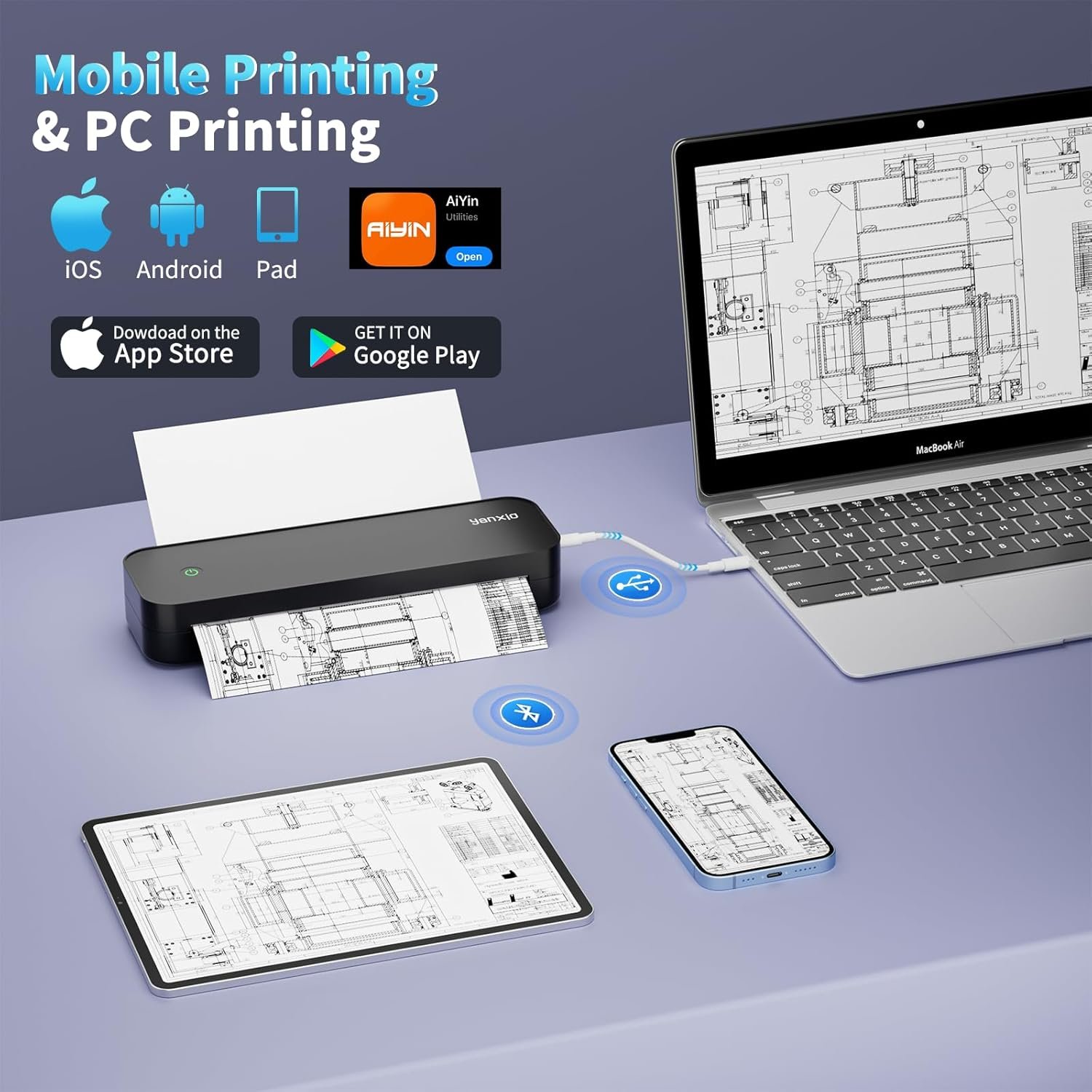 Mobile Printer & PC Printer: It is bluetooth printer to work with mobile phone via App and wireless portable printer for PC via USB cable connection. It is also a travel printer for business travel use and outside printing. PC printing driver available at Amazon Cloud ( Alreay on instruction manual),please also see more video instruction on this page.