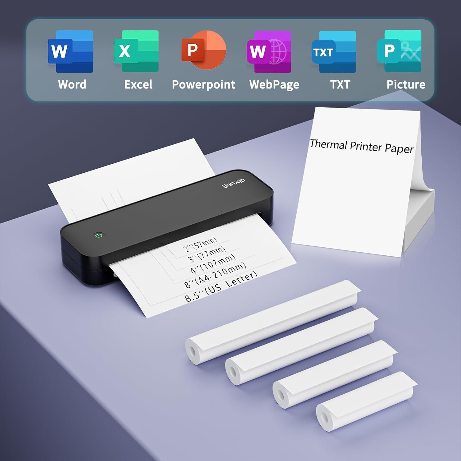 Thermal Printer only support Thermal Paper: This inkless portable printer support multiple sizes of therm printer papers from maximum 8.5”x11” Letter size to minimum 2”. With Letter/A4 size to print business documents & receipt for business use, with 4”/3”/2” small thermal paper, you can print pictures, drawings, stickers, lables, receipts, etc.